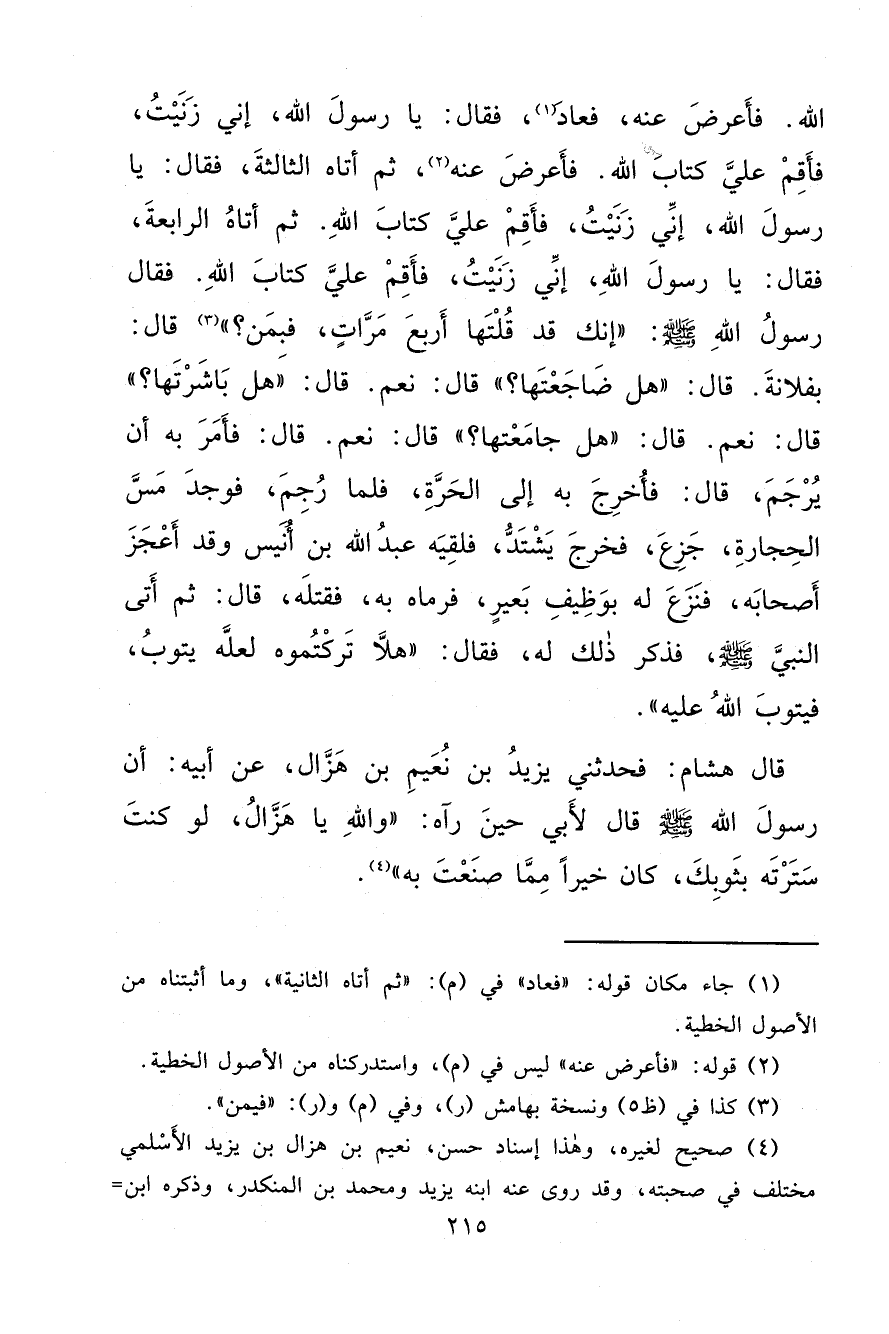 اللهِ. فَأَعْرَضَ عَنْهُ، فَعَادَ، (١) فَقَالَ: يَا رَسُولَ اللهِ، إِنِّي زَنَيْتُ، فَأَقِمْ عَلَيَّ كِتَابَ اللهِ. فَأَعْرَضَ عَنْهُ (٢) ، ثُمَّ أَتَاهُ الثَّالِثَةَ، فَقَالَ: يَا رَسُولَ اللهِ، إِنِّي زَنَيْتُ، فَأَقِمْ عَلَيَّ كِتَابَ اللهِ. ثُمَّ أَتَاهُ الرَّابِعَةَ، فَقَالَ: يَا رَسُولَ اللهِ، إِنِّي زَنَيْتُ، فَأَقِمْ عَلَيَّ كِتَابَ اللهِ. فَقَالَ رَسُولُ اللهِ صَلَّى اللهُ عَلَيْهِ وَسَلَّمَ: " " إِنَّكَ قَدْ قُلْتَهَا أَرْبَعَ مَرَّاتٍ، فَبِمَنْ؟ " (٣) " قَالَ: بِفُلَانَةَ. قَالَ: " " هَلْ ضَاجَعْتَهَا؟ " " قَالَ: نَعَمْ. قَالَ: " " هَلْ بَاشَرْتَهَا؟ " " قَالَ: نَعَمْ. قَالَ: " " هَلْ جَامَعْتَهَا؟ " " قَالَ: نَعَمْ. قَالَ: فَأَمَرَ بِهِ أَنْ يُرْجَمَ، قَالَ: فَأُخْرِجَ بِهِ إِلَى الْحَرَّةِ، فَلَمَّا رُجِمَ، فَوَجَدَ مَسَّ الْحِجَارَةِ، جَزَعَ، فَخَرَجَ يَشْتَدُّ، فَلَقِيَهُ عَبْدُ اللهِ بْنُ أُنَيْسٍ، وَقَدْ أَعْجَزَ أَصْحَابَهُ، فَنَزَعَ لَهُ بِوَظِيفِ بَعِيرٍ، فَرَمَاهُ بِهِ، فَقَتَلَهُ، قَالَ: ثُمَّ أَتَى النَّبِيَّ صَلَّى اللهُ عَلَيْهِ وَسَلَّمَ، فَذَكَرَ ذَلِكَ لَهُ، فَقَالَ: " " هَلَّا تَرَكْتُمُوهُ لَعَلَّهُ يَتُوبُ، فَيَتُوبَ اللهُ عَلَيْهِ " " قَالَ هِشَامٌ: فَحَدَّثَنِي يَزِيدُ بْنُ نُعَيْمِ بْنِ هَزَّالٍ، عَنْ أَبِيهِ: أَنَّ رَسُولَ اللهِ صَلَّى اللهُ عَلَيْهِ وَسَلَّمَ قَالَ لِأَبِي حِينَ رَآهُ: " " وَاللهِ يَا هَزَّالُ، لَوْ كُنْتَ سَتَرْتَهُ بِثَوْبِكَ، كَانَ خَيْرًا مِمَّا صَنَعْتَ بِهِ " (٤)