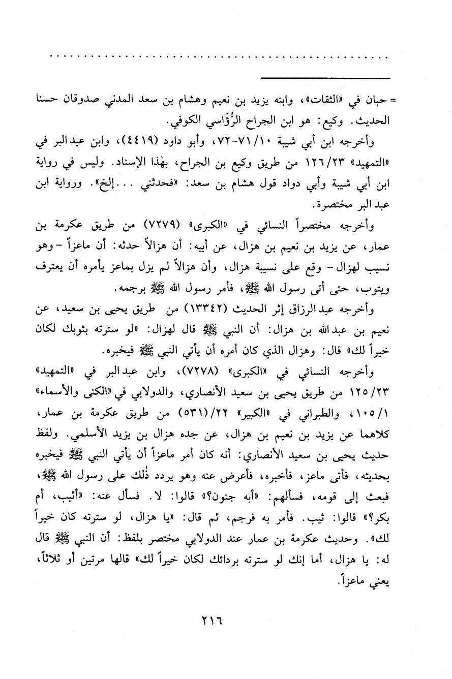 وأخرجه النسائي في "الكبرى" (٧٢٧٨) ، وابن عبد البر في "التمهيد" ٢٣/١٢٥ من طريق يحيى بن سعيد الأنصاري، والدولابي في "الكنى والأسماء" ١/١٠٥، والطبراني في "الكبير" ٢٢/ (٥٣١) من طريق عكرمة بن عمار، كلاهما عن يزيد بن نعيم بن هزال، عن جده هزال بن يزيد الأسلمي. ولفظ حديث يحيى بن سعيد الأنصاري: أنه كان أمر ماعزاً أن يأتي النبي صَلَّى اللَّه عَلَيْهِ وَسَلَّمَ فيخبره بحديثه، فأتى ماعز، فأخبره، فأعرض عنه وهو يردد ذلك على رسول الله صَلَّى اللهُ عَلَيْهِ وَسَلَّمَ، فبعث إلى قومه، فسألهم: "أبه جنون؟ " قالوا: لا. فسأل عنه: "أثيب، أم بكر؟ " قالوا: ثيب. فأمر به فرجم، ثم قال: "يا هزال، لو سترته كان خيراً لك". وحديث عكرمة بن عمار عند الدولابي مختصر بلفظ: "أن النبي صَلَّى اللهُ عَلَيْهِ وَسَلَّمَ قال له: يا هزال، أما إنك لو سترته بردائك لكان خيراً لك" قالها مرتين أو ثلاثاً، يعني ماعزاً.