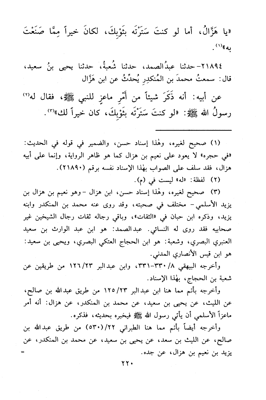٢١٨٩٤ - حَدَّثَنَا عَبْدُ الصَّمَدِ، حَدَّثَنَا شُعْبَةُ، حَدَّثَنَا يَحْيَى بْنُ سَعِيدٍ، قَالَ: سَمِعْتُ مُحَمَّدَ بْنَ الْمُنْكَدِرِ، يُحَدِّثُ عَنِ ابْنِ هَزَّالٍ، عَنْ أَبِيهِ: أَنَّهُ ذَكَرَ شَيْئًا مِنْ أَمْرِ مَاعِزٍ لِلنَّبِيِّ صَلَّى اللهُ عَلَيْهِ وَسَلَّمَ، فَقَالَ له (٢) رَسُولُ اللهِ صَلَّى اللهُ عَلَيْهِ وَسَلَّمَ: " لَوْ كُنْتَ سَتَرْتَهُ بِثَوْبِكَ، كَانَ خَيْرًا لَكَ " (٣)