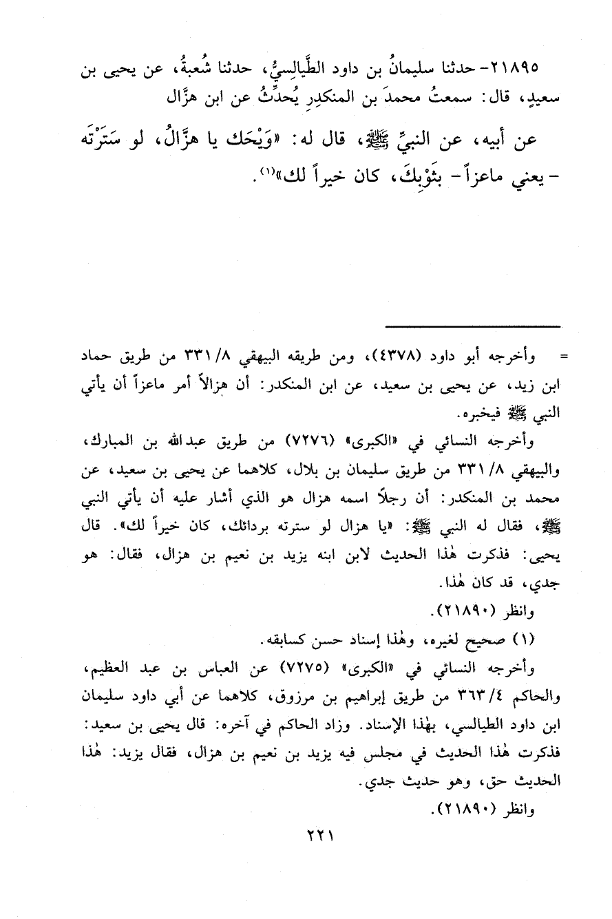 ٢١٨٩٥ - حَدَّثَنَا سُلَيْمَانُ بْنُ دَاوُدَ الطَّيَالِسِيُّ، حَدَّثَنَا شُعْبَةُ، عَنْ يَحْيَى بْنِ سَعِيدٍ، قَالَ: سَمِعْتُ مُحَمَّدَ بْنَ الْمُنْكَدِرِ، يُحَدِّثُ عَنِ ابْنِ هَزَّالٍ، عَنْ أَبِيهِ، عَنِ النَّبِيِّ صَلَّى اللهُ عَلَيْهِ وَسَلَّمَ قَالَ لَهُ: " " وَيْحَكَ يَا هَزَّالُ، لَوْ سَتَرْتَهُ، يَعْنِي مَاعِزًا، بِثَوْبِكَ، كَانَ خَيْرًا لَكَ " " (١)
