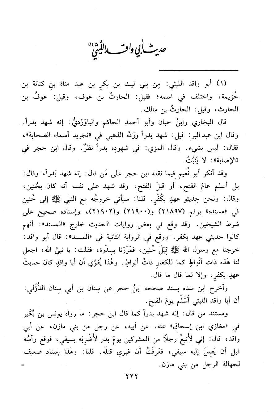 وقد أنكر أبو نُعيم فيما نقله ابن حجر على مَن قال: إنه شهد بَدراً، وقال: بل أسلم عامَ الفتح، أو قبلَ الفتح، وقد شهد على نفسه أنه كان بحُنين، وقال: ونحن حديثو عهدٍ بكُفْرٍ. قلنا: سيأتي خروجُه مع النبي صَلَّى اللَّه عَلَيْهِ وَسَلَّمَ إلى حُنين في "مسنده" برقم (٢١٨٩٧) و (٢١٩٠٠) و (٢١٩٠٢) ، وإسناده صحيح على شرط الشيخين. وقد وقع في بعض روايات الحديث خارج "المسند": أنهم كانوا حديثي عهد بكفر. ووقع في الرواية الثانية في "المسند": قال أبو واقد: