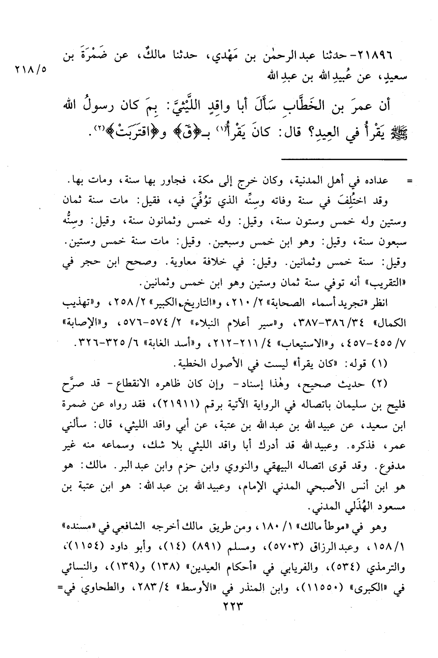 ٢١٨٩٦ - حَدَّثَنَا عَبْدُ الرَّحْمَنِ بْنُ مَهْدِيٍّ، حَدَّثَنَا مَالِكٌ، عَنْ ضَمْرَةَ بْنِ سَعِيدٍ، عَنْ عُبَيْدِ اللهِ بْنِ عَبْدِ اللهِ، أَنَّ عُمَرَ بْنَ الْخَطَّابِ سَأَلَ أَبَا وَاقِدٍ اللَّيْثِيَّ: بِمَ كَانَ رَسُولُ اللهِ صَلَّى اللهُ عَلَيْهِ وَسَلَّمَ يَقْرَأُ فِي الْعِيدِ؟ قَالَ: " كَانَ يَقْرَأُ (١) بِـ (قَ) وَ (اقْتَرَبَتْ) " (٢)