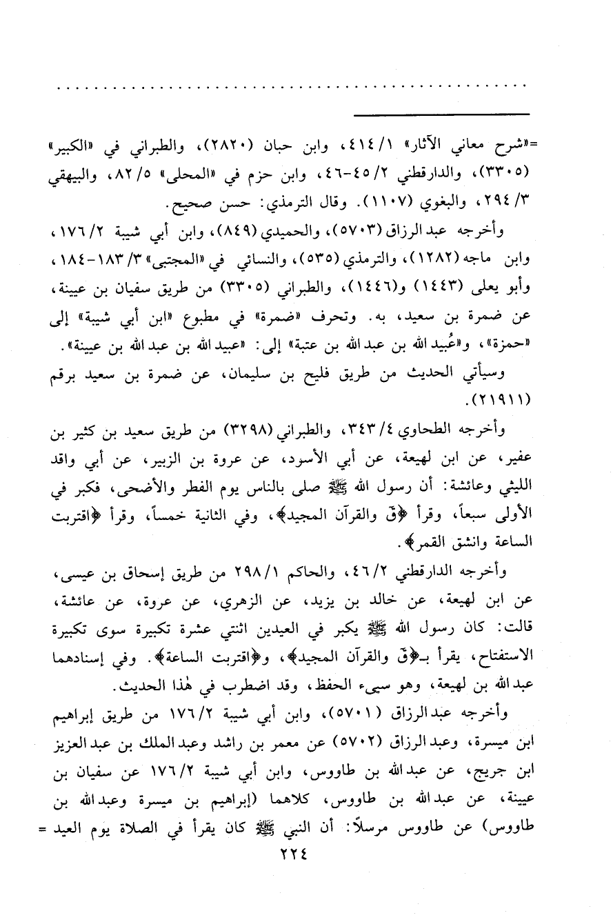 وأخرجه الدارقطني ٢/٤٦، والحاكم ١/٢٩٨ من طريق إسحاق بن عيسى، عن ابن لهيعة، عن خالد بن يزيد، عن الزهري، عن عروة، عن عائشة، قالت: كان رسول الله صَلَّى اللَّه عَلَيْهِ وَسَلَّمَ يكبر في العيدين اثنتي عشرة تكبيرة سوى تكبيرة الاستفتاح، يقرأ بـ (ق وَالقُرْآنِ المَجِيدِ) ، و (اقْتَرَبَتِ السَّاعَةُ) . وفي إسنادهما عبد الله بن لهيعة، وهو سيئ الحفظ، وقد اضطرب في هذا الحديث.