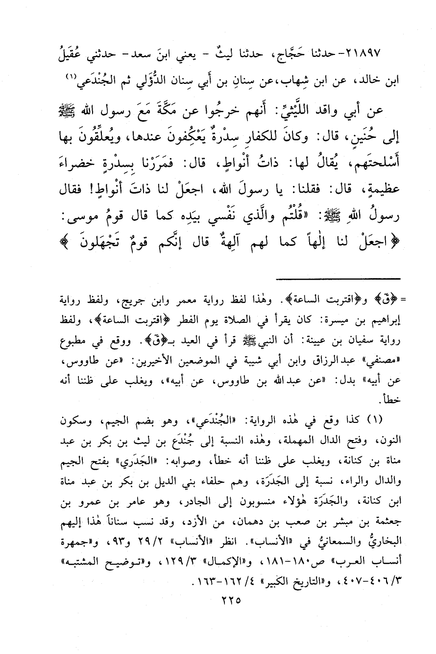 ٢١٨٩٧ - حَدَّثَنَا حَجَّاجٌ، حَدَّثَنَا لَيْثٌ يَعْنِي ابْنَ سَعْدٍ، حَدَّثَنِي عُقَيْلُ بْنُ خَالِدٍ، عَنِ ابْنِ شِهَابٍ، عَنْ سِنَانِ بْنِ أَبِي سِنَانٍ الدُّؤَلِيِّ ثُمَّ الْجُنْدَعِيِّ، (١) عَنْ أَبِي وَاقِدٍ اللَّيْثِيِّ: أَنَّهُمْ خَرَجُوا عَنْ مَكَّةَ مَعَ رَسُولِ اللهِ صَلَّى اللهُ عَلَيْهِ وَسَلَّمَ إِلَى حُنَيْنٍ، قَالَ: وَكَانَ لِلْكُفَّارِ سِدْرَةٌ يَعْكُفُونَ عِنْدَهَا، وَيُعَلِّقُونَ بِهَا أَسْلِحَتَهُمْ، يُقَالُ لَهَا: ذَاتُ أَنْوَاطٍ، قَالَ: فَمَرَرْنَا بِسِدْرَةٍ خَضْرَاءَ عَظِيمَةٍ، قَالَ: فَقُلْنَا: يَا رَسُولَ اللهِ، اجْعَلْ لَنَا ذَاتَ أَنْوَاطٍ فَقَالَ رَسُولُ اللهِ صَلَّى اللهُ عَلَيْهِ وَسَلَّمَ: " قُلْتُمْ وَالَّذِي نَفْسِي بِيَدِهِ كَمَا قَالَ قَوْمُ مُوسَى: {اجْعَلْ لَنَا إِلَهًا كَمَا لَهُمْ آلِهَةً قَالَ إِنَّكُمْ قَوْمٌ تَجْهَلُونَ}