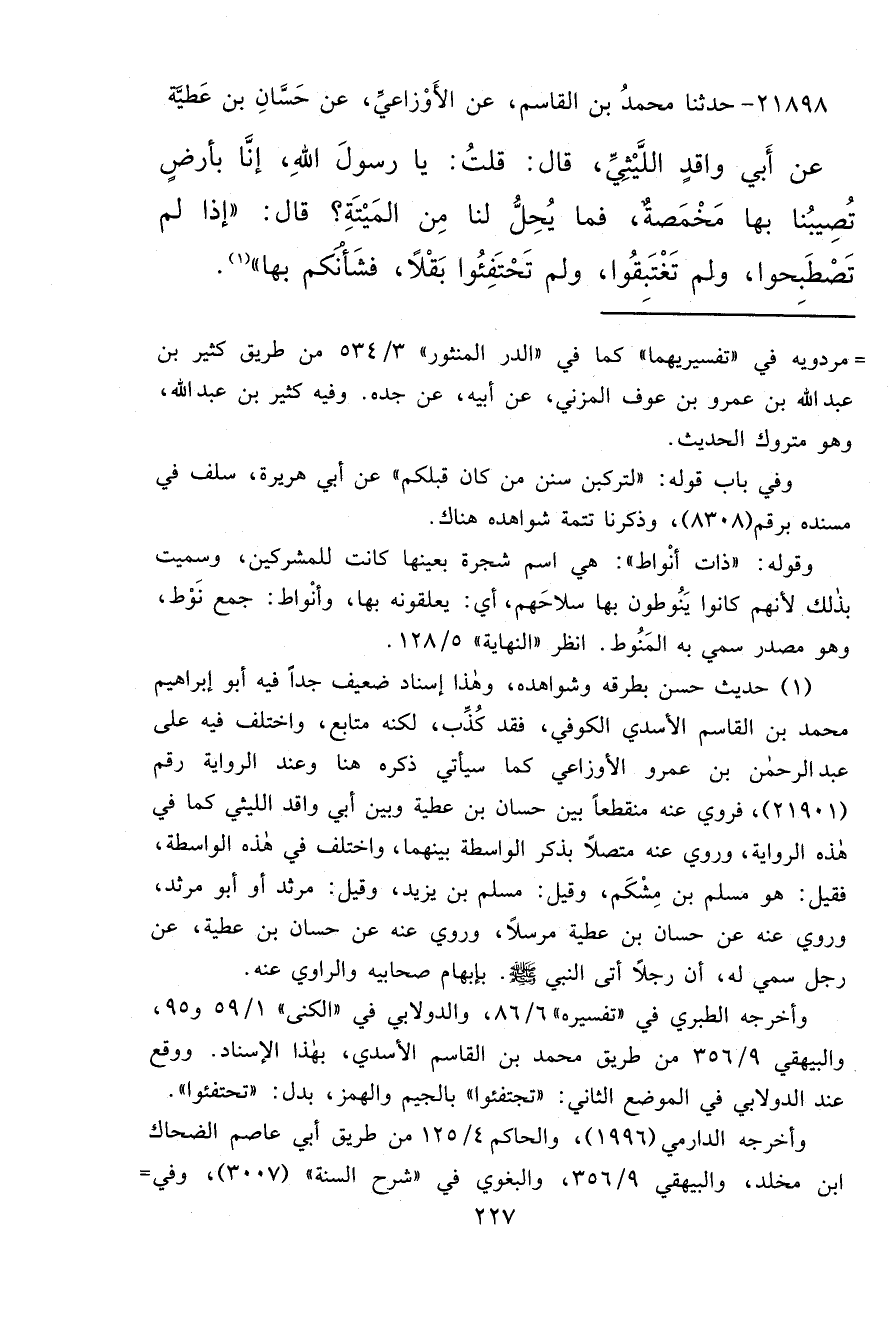 ٢١٨٩٨ - حَدَّثَنَا مُحَمَّدُ بْنُ الْقَاسِمِ، عَنِ الْأَوْزَاعِيِّ، عَنْ حَسَّانَ بْنِ عَطِيَّةَ، عَنْ أَبِي وَاقِدٍ اللَّيْثِيِّ، قَالَ: قُلْتُ: يَا رَسُولَ اللهِ، إِنَّا بِأَرْضٍ تُصِيبُنَا بِهَا مَخْمَصَةٌ، فَمَا يَحِلُّ لَنَا مِنَ الْمَيْتَةِ؟ قَالَ: " إِذَا لَمْ تَصْطَبِحُوا، وَلَمْ تَغْتَبِقُوا، وَلَمْ تَحْتَفِئُوا بَقْلًا، فَشَأْنُكُمْ بِهَا " (١)
