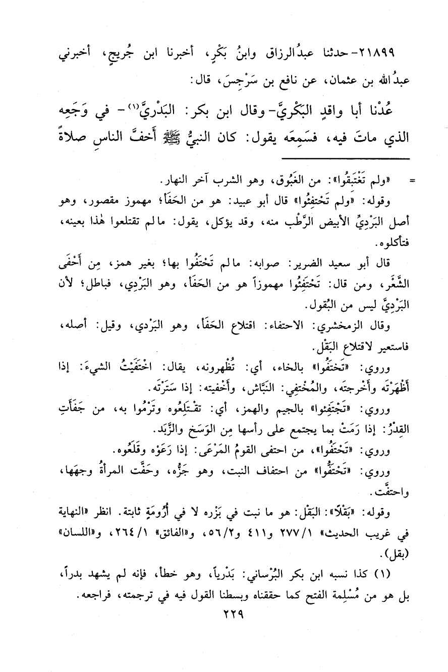 ٢١٨٩٩ - حَدَّثَنَا عَبْدُ الرَّزَّاقِ، وَابْنُ بَكْرٍ، أَخْبَرَنَا ابْنُ جُرَيْجٍ، أَخْبَرَنِي عَبْدُ اللهِ بْنُ عُثْمَانَ، عَنْ نَافِعِ بْنِ سَرْجِسَ، قَالَ: عُدْنَا أَبَا وَاقِدٍ الْبَكْرِيَّ، وَقَالَ ابْنُ بَكْرٍ: الْبَدْرِيَّ (١) ، فِي وَجَعِهِ الَّذِي مَاتَ فِيهِ، فَسَمِعَهُ يَقُولُ: " كَانَ النَّبِيُّ صَلَّى اللهُ عَلَيْهِ وَسَلَّمَ أَخَفَّ النَّاسِ صَلَاةً