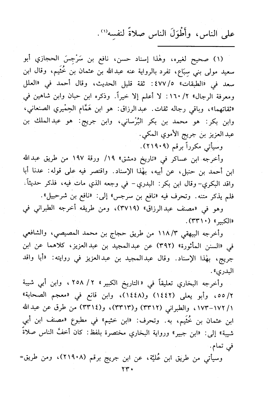 وأخرجه البخاري تعليقاً في "التاريخ الكبير" ٢/٢٥٨، وابن أبي شيبة ٢/٥٥، وأبو يعلى (١٤٤٢) و (١٤٤٨) ، وابن قانع في "معجم الصحابة" ١/١٧٢-١٧٣، والطبراني (٣٣١٢) و (٣٣١٣) ، و (٣٣١٤) من طرق عن عبد الله ابن عثمان بن خُثَيم، به. وتحرف: "ابن خثيم" في مطبوع "مصنف ابن أبي شيبة" إلى: "ابن جبير" ورواية البخاري مختصرة بلفظ: كان أخفَّ الناس صلاةً في تمام.