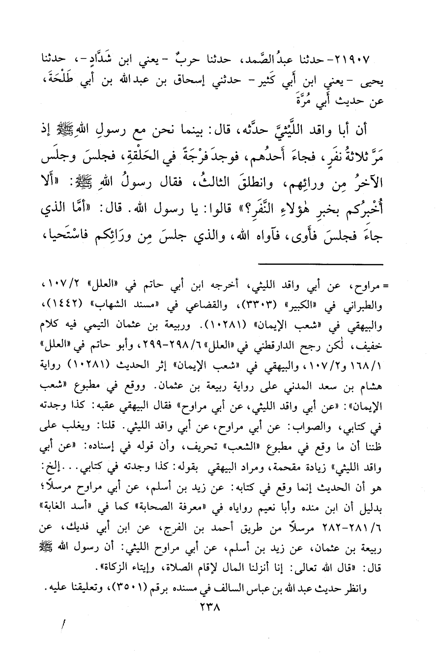 ٢١٩٠٧ - حَدَّثَنَا عَبْدُ الصَّمَدِ، حَدَّثَنَا حَرْبٌ يَعْنِي ابْنَ شَدَّادٍ، حَدَّثَنَا يَحْيَى يَعْنِي ابْنَ أَبِي كَثِيرٍ، حَدَّثَنِي إِسْحَاقُ بْنُ عَبْدِ اللهِ بْنِ أَبِي طَلْحَةَ، عَنْ حَدِيثِ أَبِي مُرَّةَ، أَنَّ أَبَا وَاقِدٍ اللَّيْثِيَّ، حَدَّثَهُ قَالَ: بَيْنَمَا نَحْنُ مَعَ رَسُولِ اللهِ صَلَّى اللهُ عَلَيْهِ وَسَلَّمَ إِذْ مَرَّ ثَلَاثَةُ نَفَرٍ، فَجَاءَ أَحَدُهُمْ، فَوَجَدَ فُرْجَةً فِي الْحَلْقَةِ، فَجَلَسَ وَجَلَسَ الْآخَرُ مِنْ وَرَائِهِمْ، وَانْطَلَقَ الثَّالِثُ، فَقَالَ رَسُولُ اللهِ صَلَّى اللهُ عَلَيْهِ وَسَلَّمَ: " أَلَا أُخْبِرُكُمْ بِخَبَرِ هَؤُلَاءِ النَّفَرِ؟ " قَالُوا: بَلَى يَا رَسُولَ اللهِ. قَالَ: " أَمَّا الَّذِي جَاءَ فَجَلَسَ فَأَوَى، فَآوَاهُ اللهُ، وَالَّذِي جَلَسَ مِنْ وَرَائِكُمْ فَاسْتَحْيَا،