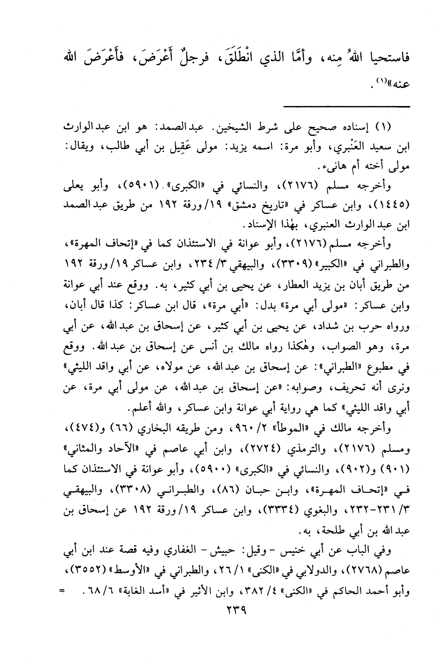 وأخرجه مسلم (٢١٧٦) ، وأبو عوانة في الاستئذان كما في "إتحاف المهرة"، والطبراني في "الكبير" (٣٣٠٩) ، والبيهقي ٣/٢٣٤، وابن عساكر ١٩/ورقة ١٩٢ من طريق أبان بن يزيد العطار، عن يحيى بن أبي كثير، به. ووقع عند أبي عوانة وابن عساكر: "مولى أبي مرة" بدل: "أبي مرة"، قال ابن عساكر: كذا قال أبان، ورواه حرب بن شداد، عن يحيى بن أبي كثير، عن إسحاق بن عبد الله، عن أبي مرة، وهو الصواب، وهكذا رواه مالك بن أنس عن إسحاق بن عبد الله. ووقع في مطبوع "الطبراني": "عن إسحاق بن عبد الله، عن مولاه، عن أبي واقد الليثي" ونرى أنه تحريف، وصوابه: "عن إسحاق بن عبد الله، عن مولى أبي مرة، عن أبي واقد الليثي" كما هي رواية أبي عوانة وابن عساكر، والله أعلم.
