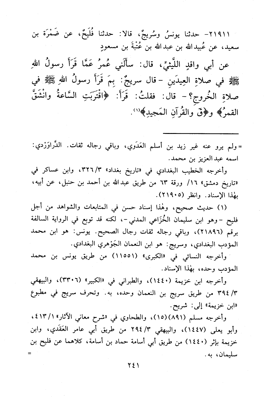 ٢١٩١١ - حَدَّثَنَا يُونُسُ، وَسُرَيْجٌ، قَالَا: حَدَّثَنَا فُلَيْحٌ، عَنْ ضَمْرَةَ بْنِ سَعِيدٍ، عَنْ عُبَيْدِ اللهِ بْنِ عَبْدِ اللهِ بْنِ عُتْبَةَ بْنِ مَسْعُودٍ، عَنْ أَبِي وَاقِدٍ اللَّيْثِيِّ، قَالَ: سَأَلَنِي عُمَرُ عَمَّا قَرَأَ رَسُولُ اللهِ صَلَّى اللهُ عَلَيْهِ وَسَلَّمَ فِي صَلَاةِ الْعِيدَيْنِ؟، قَالَ سُرَيْجٌ: بِمَ قَرَأَ رَسُولُ اللهِ صَلَّى اللهُ عَلَيْهِ وَسَلَّمَ فِي صَلَاةِ الْخُرُوجِ؟، قَالَ: فَقُلْتُ: " قَرَأَ: اقْتَرَبَتِ السَّاعَةُ وَانْشَقَّ الْقَمَرُ وَق وَالْقُرْآنِ الْمَجِيدِ " (١)