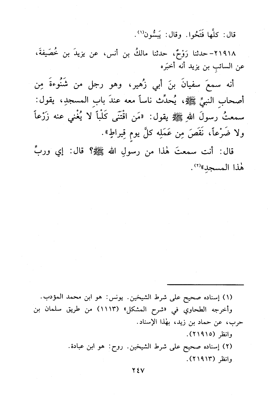 ٢١٩١٨ - حَدَّثَنَا رَوْحٌ، حَدَّثَنَا مَالِكُ بْنُ أَنَسٍ، عَنْ يَزِيدَ بْنِ خُصَيْفَةَ، عَنِ السَّائِبِ بْنِ يَزِيدَ، أَنَّهُ أَخْبَرَهُ أَنَّهُ، سَمِعَ سُفْيَانَ بْنَ أَبِي زُهَيْرٍ، وَهُوَ رَجُلٌ مِنْ شَنُوءَةَ مِنْ أَصْحَابِ النَّبِيِّ صَلَّى اللهُ عَلَيْهِ وَسَلَّمَ، يُحَدِّثُ نَاسًا مَعَهُ عِنْدَ بَابِ الْمَسْجِدِ، يَقُولُ: سَمِعْتُ رَسُولَ اللهِ صَلَّى اللهُ عَلَيْهِ وَسَلَّمَ يَقُولُ: " مَنِ اقْتَنَى كَلْبًا لَا يُغْنِي عَنْهُ زَرْعًا وَلَا ضَرْعًا، نَقَصَ مِنْ عَمَلِهِ كُلَّ يَوْمٍ قِيرَاطٌ " قَالَ: أَنْتَ سَمِعْتَ هَذَا مِنْ رَسُولِ اللهِ صَلَّى اللهُ عَلَيْهِ وَسَلَّمَ؟ قَالَ: " إِي وَرَبِّ هَذَا الْمَسْجِدِ " (٢)