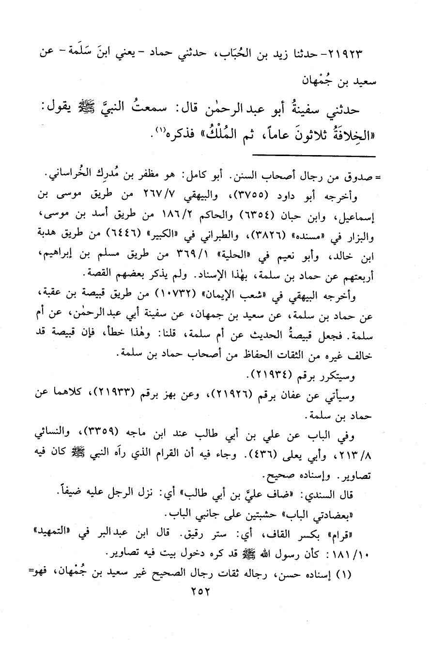 ٢١٩٢٣ - حَدَّثَنَا زَيْدُ بْنُ الْحُبَابِ، حَدَّثَنِي حَمَّادٌ يَعْنِي ابْنَ سَلَمَةَ، عَنْ سَعِيدِ بْنِ جُمْهَانَ، حَدَّثَنِي سَفِينَةُ أَبُو عَبْدِ الرَّحْمَنِ، قَالَ: سَمِعْتُ النَّبِيَّ صَلَّى اللهُ عَلَيْهِ وَسَلَّمَ يَقُولُ: " الْخِلَافَةُ ثَلَاثُونَ عَامًا ثُمَّ الْمُلْكُ " فَذَكَرَهُ (١)