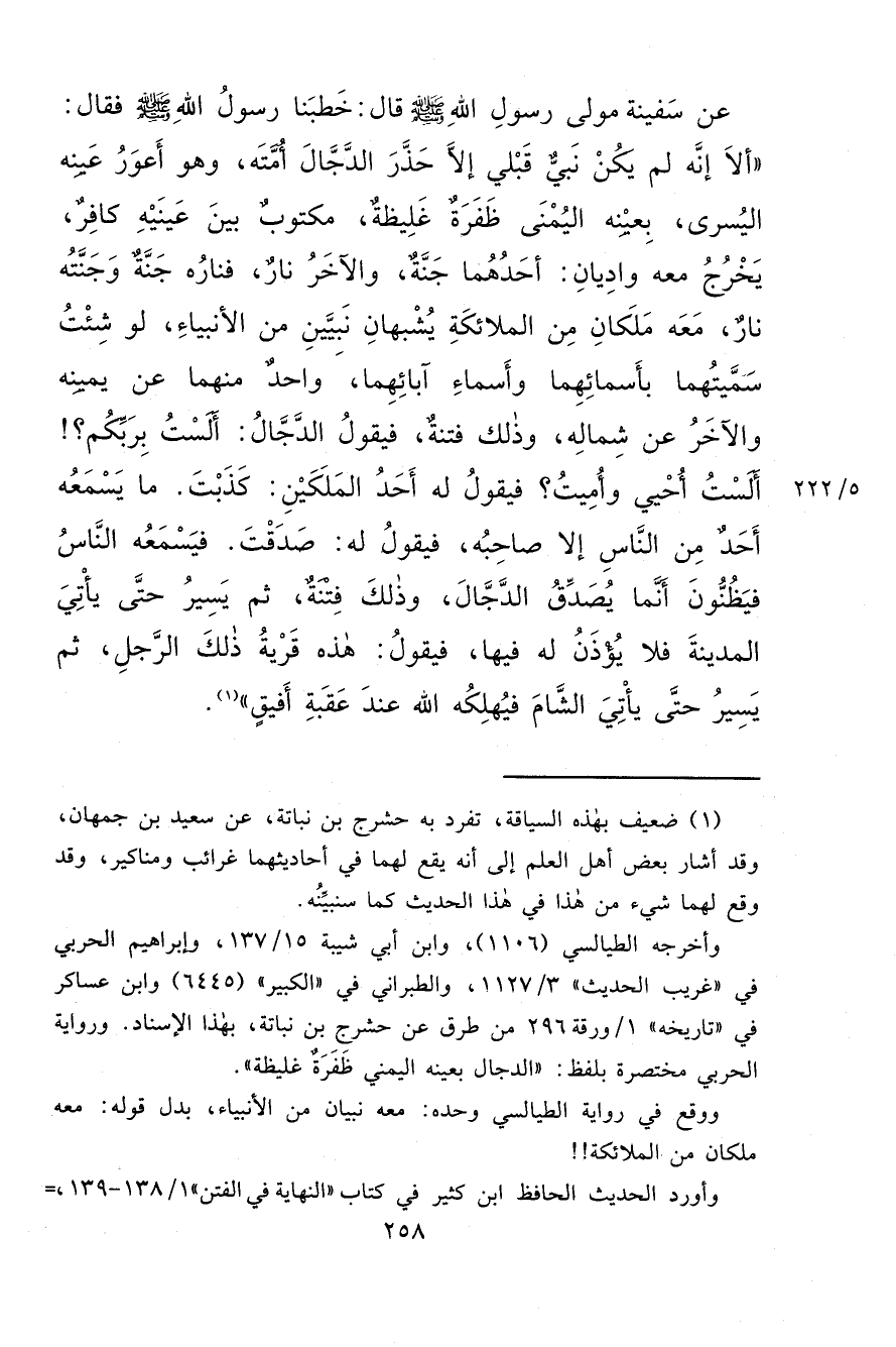 عَنْ سَفِينَةَ مَوْلَى رَسُولِ اللهِ، صَلَّى اللهُ عَلَيْهِ وَسَلَّمَ قَالَ: خَطَبَنَا رَسُولُ اللهِ صَلَّى اللهُ عَلَيْهِ وَسَلَّمَ فَقَالَ: " أَلَا إِنَّهُ لَمْ يَكُنْ نَبِيٌّ قَبْلِي إِلَّا حَذَّرَ الدَّجَّالَ أُمَّتَهُ، وَهُوَ أَعْوَرُ عَيْنِهِ الْيُسْرَى، بِعَيْنِهِ الْيُمْنَى ظُفْرَةٌ غَلِيظَةٌ، مَكْتُوبٌ بَيْنَ عَيْنَيْهِ كَافِرٌ، يَخْرُجُ مَعَهُ وَادِيَانِ: أَحَدُهُمَا جَنَّةٌ، وَالْآخَرُ نَارٌ، فَنَارُهُ جَنَّةٌ وَجَنَّتُهُ نَارٌ، مَعَهُ مَلَكَانِ مِنَ الْمَلَائِكَةِ يُشْبِهَانِ نَبِيَّيْنِ مِنَ الْأَنْبِيَاءِ، لَوْ شِئْتُ سَمَّيْتُهُمَا بِأَسْمَائِهِمَا وَأَسْمَاءِ آبَائِهِمَا، وَاحِدٌ مِنْهُمَا عَنْ يَمِينِهِ وَالْآخَرُ عَنْ شِمَالِهِ، وَذَلِكَ فِتْنَةٌ، فَيَقُولُ الدَّجَّالُ: أَلَسْتُ بِرَبِّكُمْ؟ أَلَسْتُ أُحْيِي وَأُمِيتُ؟ فَيَقُولُ لَهُ أَحَدُ الْمَلَكَيْنِ: كَذَبْتَ. مَا يَسْمَعُهُ أَحَدٌ مِنَ النَّاسِ إِلَّا صَاحِبُهُ، فَيَقُولُ لَهُ: صَدَقْتَ. فَيَسْمَعُهُ النَّاسُ فَيَظُنُّونَ إِنَّمَا يُصَدِّقُ الدَّجَّالَ، وَذَلِكَ فِتْنَةٌ، ثُمَّ يَسِيرُ حَتَّى يَأْتِيَ الْمَدِينَةَ فَلَا يُؤْذَنُ لَهُ فِيهَا، فَيَقُولُ: هَذِهِ قَرْيَةُ ذَلِكَ الرَّجُلِ، ثُمَّ يَسِيرُ حَتَّى يَأْتِيَ الشَّامَ فَيُهْلِكُهُ اللهُ عِنْدَ عَقَبَةِ أَفِيقَ " (١)