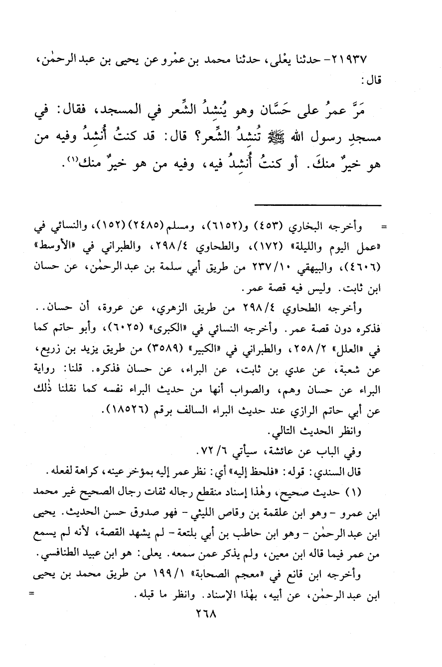 ٢١٩٣٧ - حَدَّثَنَا يَعْلَى، حَدَّثَنَا مُحَمَّدُ بْنُ عَمْرٍو، عَنْ يَحْيَى بْنِ عَبْدِ الرَّحْمَنِ، قَالَ: مَرَّ عُمَرُ عَلَى حَسَّانَ، وَهُوَ يُنْشِدُ الشِّعْرَ فِي الْمَسْجِدِ، فَقَالَ: فِي مَسْجِدِ رَسُولِ اللهِ صَلَّى اللهُ عَلَيْهِ وَسَلَّمَ تُنْشِدُ الشِّعْرَ؟ قَالَ: " قَدْ كُنْتُ أُنْشِدُ وَفِيهِ مَنْ هُوَ خَيْرٌ مِنْكَ " أَوْ " كُنْتُ أُنْشِدُ فِيهِ، وَفِيهِ مَنْ هُوَ خَيْرٌ مِنْكَ " (١)