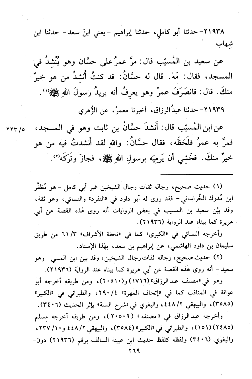 ٢١٩٣٨ - حَدَّثَنَا أَبُو كَامِلٍ، حَدَّثَنَا إِبْرَاهِيمُ يَعْنِي ابْنَ سَعْدٍ، حَدَّثَنَا ابْنُ شِهَابٍ، عَنْ سَعِيدِ بْنِ الْمُسَيِّبِ، قَالَ: مَرَّ عُمَرُ عَلَى حَسَّانَ وَهُوَ يُنْشِدُ فِي الْمَسْجِدِ، فَقَالَ: مَهْ. قَالَ لَهُ حَسَّانُ: " قَدْ كُنْتُ أُنْشِدُ مَنْ هُوَ خَيْرٌ مِنْكَ "، قَالَ: فَانْصَرَفَ عُمَرُ وَهُوَ يَعْرِفُ أَنَّهُ يُرِيدُ رَسُولَ اللهِ صَلَّى اللهُ عَلَيْهِ وَسَلَّمَ (١)