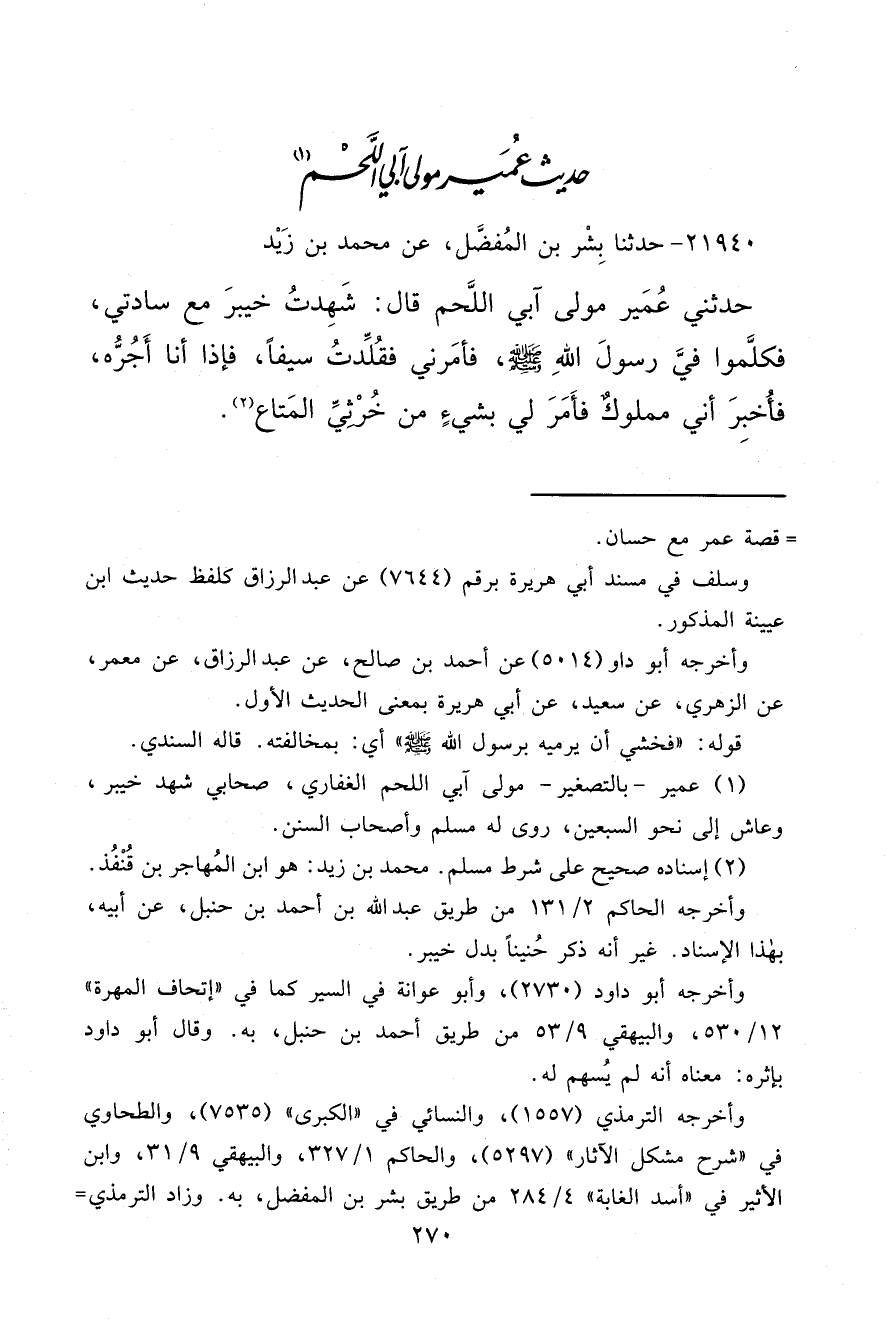٢١٩٤٠ - حَدَّثَنَا بِشْرُ بْنُ الْمُفَضَّلِ، عَنْ مُحَمَّدِ بْنِ زَيْدٍ، حَدَّثَنِي عُمَيْرٌ، مَوْلَى آبِي اللَّحْمِ، قَالَ: شَهِدْتُ خَيْبَرَ مَعَ سَادَتِي، فَكَلَّمُوا فِيَّ رَسُولَ اللهِ صَلَّى اللهُ عَلَيْهِ وَسَلَّمَ " فَأَمَرَنِي فَقُلِّدْتُ سَيْفًا، فَإِذَا أَنَا أَجُرُّهُ، فَأُخْبِرَ أَنِّي مَمْلُوكٌ فَأَمَرَ لِي بِشَيْءٍ مِنْ خُرْثِيِّ الْمَتَاعِ " (٢)