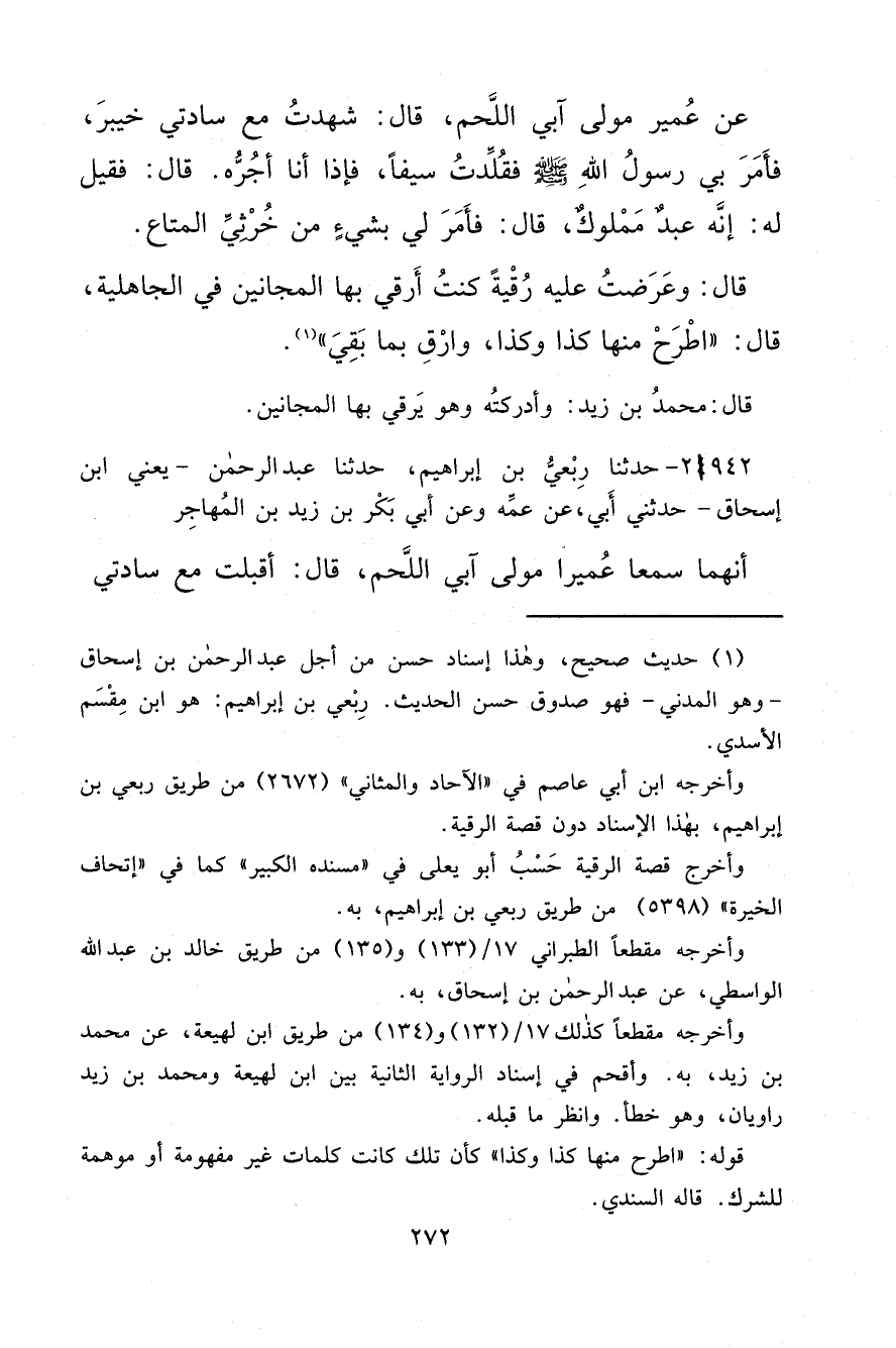 عَنْ عُمَيْرٍ مَوْلَى آبِي اللَّحْمِ، قَالَ: شَهِدْتُ مَعَ سَادَتِي خَيْبَرَ، فَأَمَرَ بِي رَسُولُ اللهِ صَلَّى اللهُ عَلَيْهِ وَسَلَّمَ فَقُلِّدْتُ سَيْفًا، فَإِذَا أَنَا أَجُرُّهُ قَالَ: فَقِيلَ لَهُ: إِنَّهُ عَبْدٌ مَمْلُوكٌ قَالَ: " فَأَمَرَ لِي بِشَيْءٍ مِنْ خُرْثِيِّ الْمَتَاعِ "