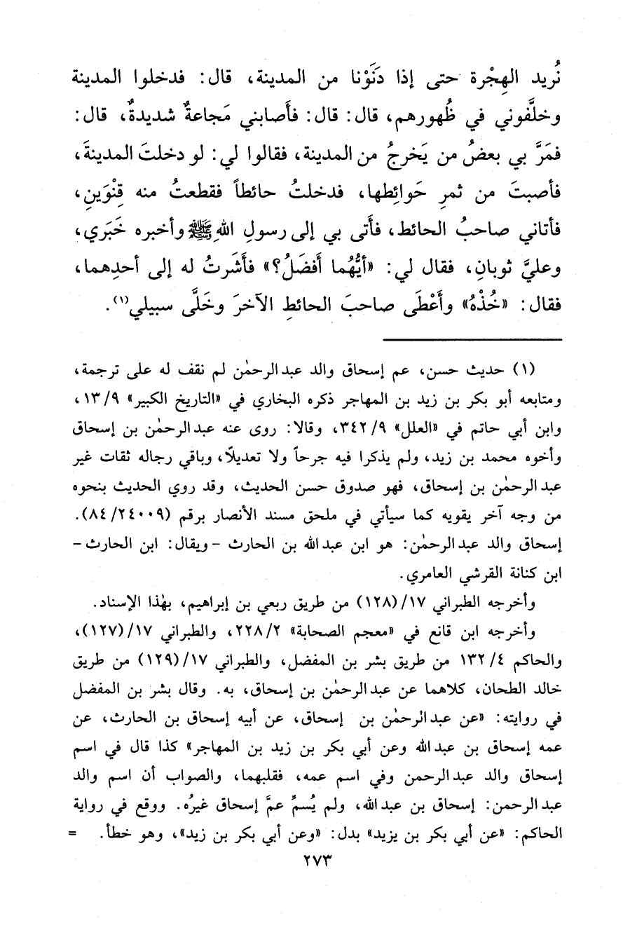 وأخرجه ابن قانع في "معجم الصحابة" ٢/٢٢٨، والطبراني ١٧/ (١٢٧) ، والحاكم ٤/١٣٢ من طريق بشر بن المفضل، والطبراني ١٧/ (١٢٩) من طريق خالد الطحان، كلاهما عن عبد الرحمن بن إسحاق، به. وقال بشر بن المفضل في روايته: "عن عبد الرحمن بن إسحاق، عن أبيه إسحاق بن الحارث، عن عمه إسحاق بن عبد الله وعن أبي بكر بن زيد بن المهاجر" كذا قال في اسم إسحاق والد عبد الرحمن وفي اسم عمه، فقلبهما، والصواب ان اسم والد عبد الرحمن: إسحاق بن عبد الله، ولم يُسمِّ عمَّ إسحاق غيرُه. ووقع في رواية الحاكم: "عن أبي بكر بن يزيد" بدل: "وعن أبي بكر بن زيد"، وهو خطأ. =
