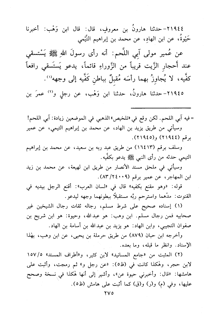 (١) إسناده صحيح على شرط مسلم، رجاله ثقات رجال الشيخين غير صحابيه فمن رجال مسلم. ابن وهب: هو عبد الله، وحيوة: هو ابن شريح بن صفوان التجيبي، وابن الهاد: هو يزيد بن عبد الله بن أسامة بن الهاد.