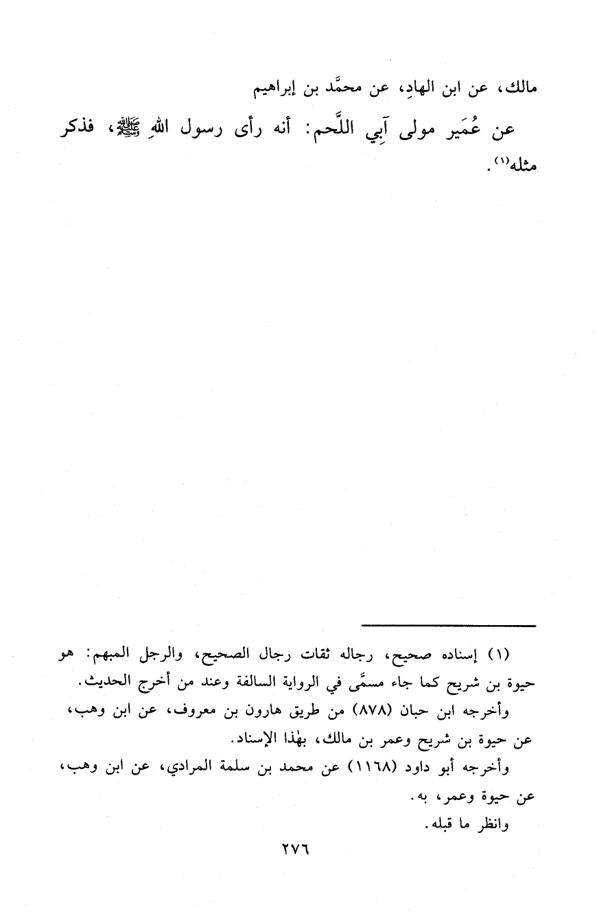 مَالِكٍ، عَنِ ابْنِ الْهَادِ، عَنْ مُحَمَّدِ بْنِ إِبْرَاهِيمَ، عَنْ عُمَيْرٍ مَوْلَى آبِي اللَّحْمِ: أَنَّهُ رَأَى رَسُولَ اللهِ صَلَّى اللهُ عَلَيْهِ وَسَلَّمَ، فَذَكَرَ مِثْلَهُ (١)