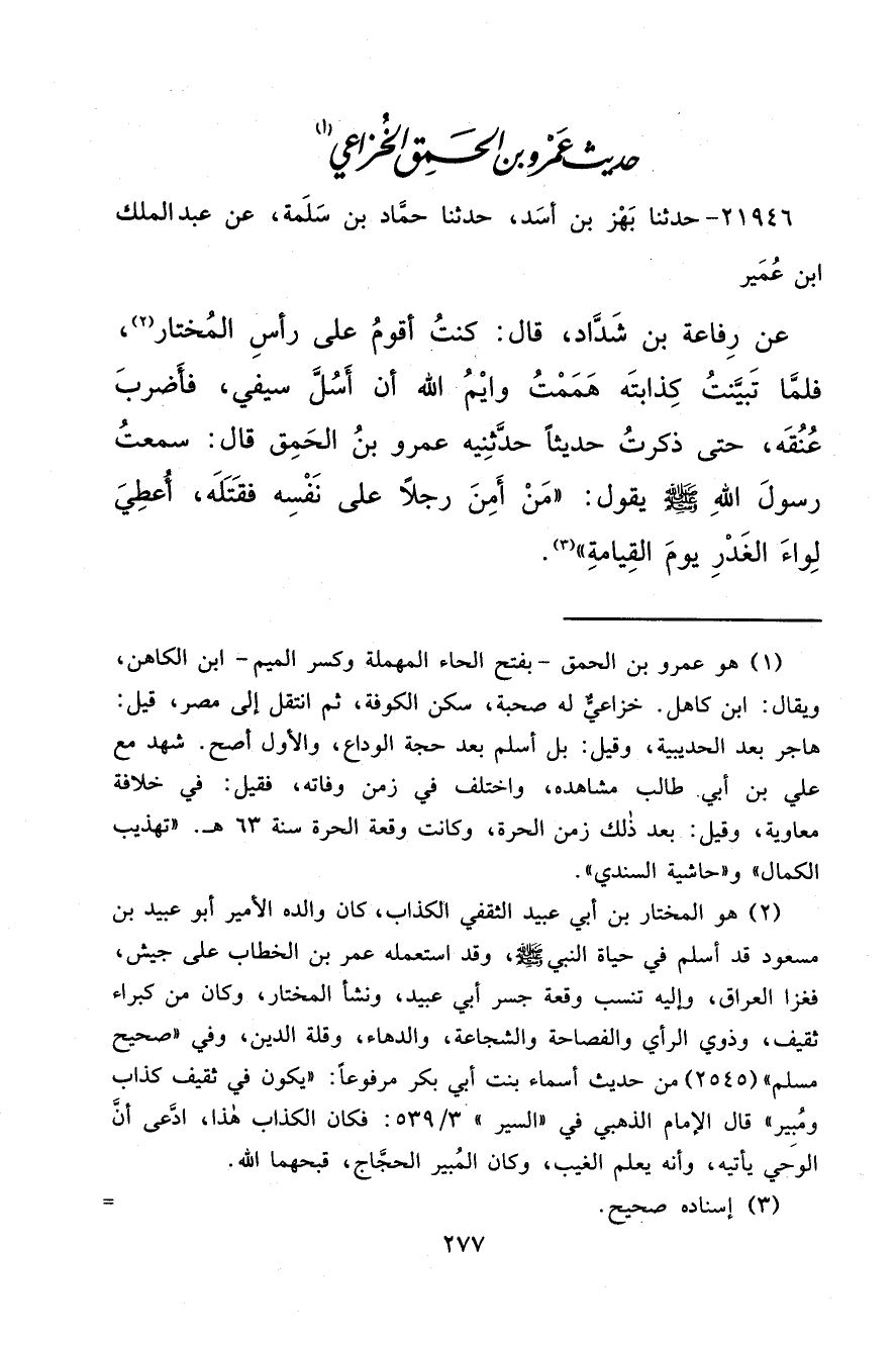 ٢١٩٤٦ - حَدَّثَنَا بَهْزُ بْنُ أَسَدٍ، حَدَّثَنَا حَمَّادُ بْنُ سَلَمَةَ، عَنْ عَبْدِ الْمَلِكِ بْنِ عُمَيْرٍ، عَنْ رِفَاعَةَ بْنِ شَدَّادٍ، قَالَ: كُنْتُ أَقُومُ عَلَى رَأْسِ الْمُخْتَارِ (٢) ، فَلَمَّا تَبَيَّنْتُ كِذَابَتَهُ هَمَمْتُ وَايْمُ اللهِ أَنْ أَسُلَّ سَيْفِي، فَأَضْرِبَ عُنُقَهُ، حَتَّى ذَكَرْتُ حَدِيثًا حَدَّثَنِيهِ عَمْرُو بْنُ الْحَمِقِ، قَالَ: سَمِعْتُ رَسُولَ اللهِ صَلَّى اللهُ عَلَيْهِ وَسَلَّمَ يَقُولُ: " مَنْ أَمَّنَ رَجُلًا عَلَى نَفْسِهِ فَقَتَلَهُ، أُعْطِيَ لِوَاءَ الْغَدْرِ يَوْمَ الْقِيَامَةِ " (٣)
