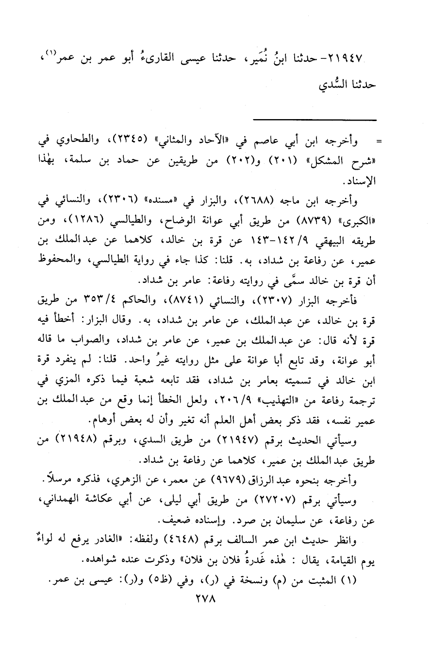 وسيأتي الحديث برقم (٢١٩٤٧) من طريق السدي، وبرقم (٢١٩٤٨) من طريق عبد الملك بن عمير، كلاهما عن رفاعة بن شداد.