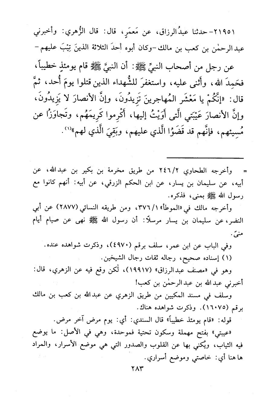 ٢١٩٥١ - حَدَّثَنَا عَبْدُ الرَّزَّاقِ، عَنْ مَعْمَرٍ، قَالَ: قَالَ الزُّهْرِيُّ: وَأَخْبَرَنِي عَبْدُ الرَّحْمَنِ بْنُ كَعْبِ بْنِ مَالِكٍ، وَكَانَ أَبُوهُ أَحَدَ الثَّلَاثَةِ الَّذِينَ تِيبَ عَلَيْهِمْ، عَنْ رَجُلٍ، مِنْ أَصْحَابِ النَّبِيِّ صَلَّى اللهُ عَلَيْهِ وَسَلَّمَ: أَنَّ النَّبِيَّ صَلَّى اللهُ عَلَيْهِ وَسَلَّمَ قَامَ يَوْمَئِذٍ خَطِيبًا، فَحَمِدَ اللهَ، وَأَثْنَى عَلَيْهِ، وَاسْتَغْفَرَ لِلشُّهَدَاءِ الَّذِينَ قُتِلُوا يَوْمَ أُحُدٍ، ثُمَّ قَالَ: " إِنَّكُمْ يَا مَعْشَرَ الْمُهَاجِرِينَ تَزِيدُونَ، وَإِنَّ الْأَنْصَارَ لَا يَزِيدُونَ، وَإِنَّ الْأَنْصَارَ عَيْبَتِي الَّتِي أَوَيْتُ إِلَيْهَا، أَكْرِمُوا كَرِيمَهُمْ، وَتَجَاوَزُوا عَنْ مُسِيئِهِمْ، فَإِنَّهُمْ قَدْ قَضَوْا الَّذِي عَلَيْهِمْ، وَبَقِيَ الَّذِي لَهُمْ " (١)