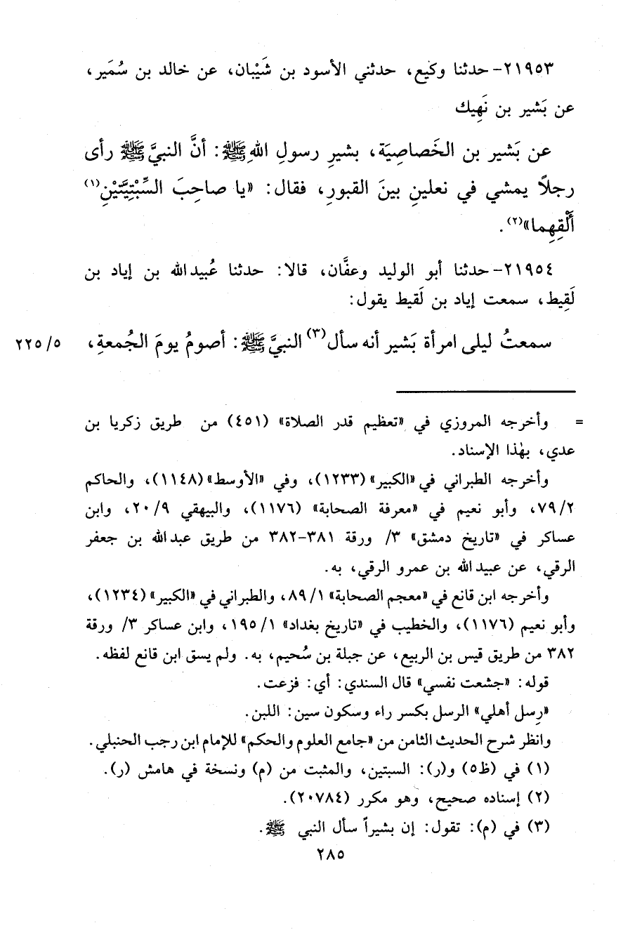 ٢١٩٥٣ - حَدَّثَنَا وَكِيعٌ، حَدَّثَنِي الْأَسْوَدُ بْنُ شَيْبَانَ، عَنْ خَالِدِ بْنِ سُمَيْرٍ، عَنْ بَشِيرِ بْنِ نَهِيكٍ، عَنْ بَشِيرِ ابْنِ الْخَصَاصِيَّةِ بَشِيرِ رَسُولِ اللهِ صَلَّى اللهُ عَلَيْهِ وَسَلَّمَ: أَنَّ النَّبِيَّ صَلَّى اللهُ عَلَيْهِ وَسَلَّمَ رَأَى رَجُلًا يَمْشِي فِي نَعْلَيْنِ بَيْنَ الْقُبُورِ، فَقَالَ: " يَا صَاحِبَ السِّبْتِيَّتَيْنِ (١) أَلْقِهِمَا " (٢)