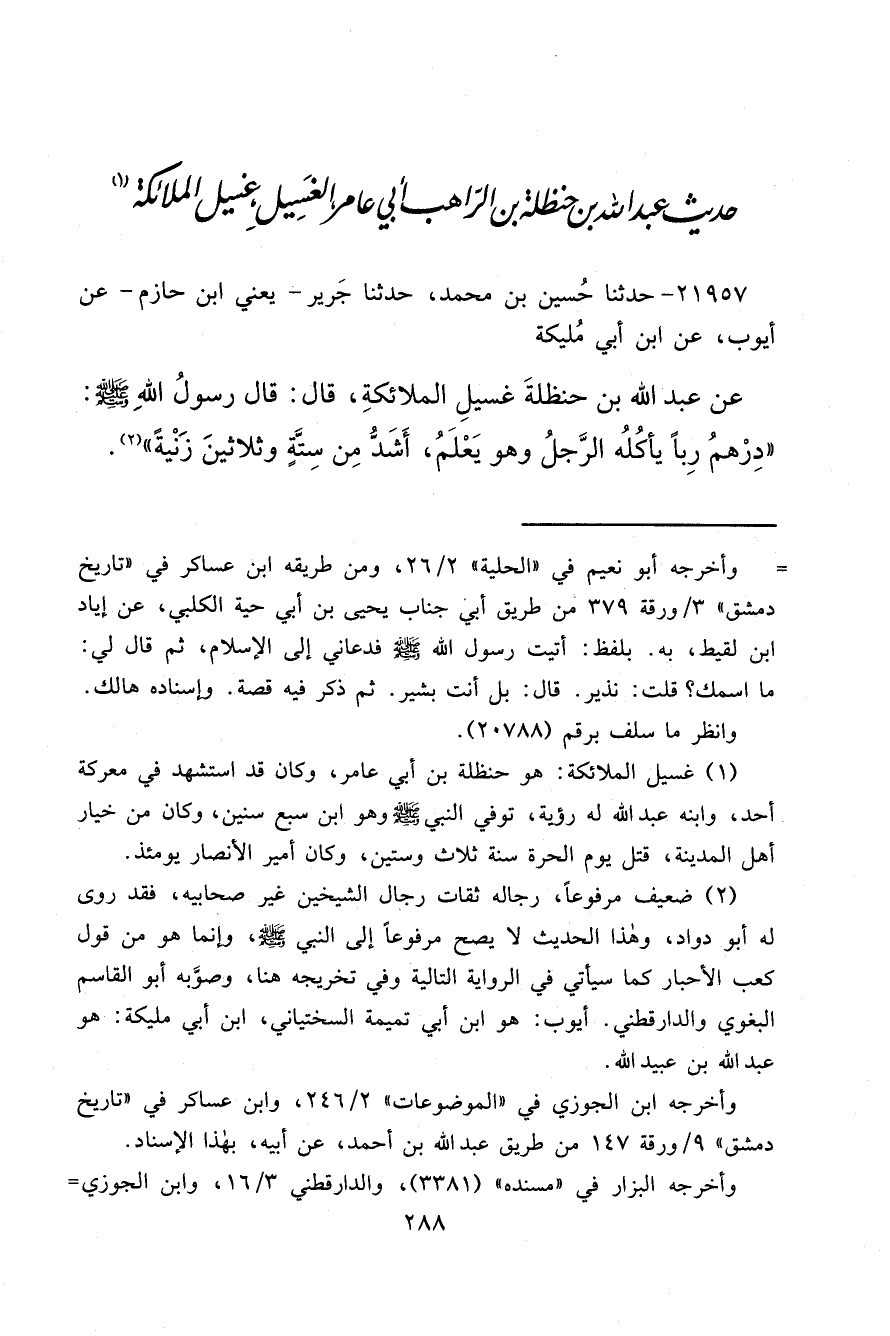 حَدِيثُ عَبْدِ اللهِ بْنِ حَنْظَلَةَ ابْنِ الرَّاهِبِ أَبِي عَامِرٍ الغَسيلِ غَسِيلِ المَلائِكَةِ (١)