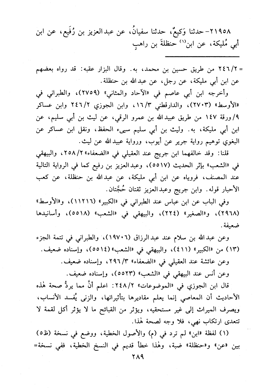 ٢١٩٥٨ - حَدَّثَنَا وَكِيعٌ، حَدَّثَنَا سُفْيَانُ، عَنْ عَبْدِ الْعَزِيزِ بْنِ رُفَيْعٍ، عَنْ ابْنِ أَبِي مُلَيْكَةَ، عَنِ ابْنِ (١) حَنْظَلَةَ بْنِ الرَّاهِبِ،