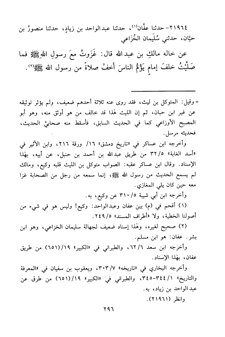 ٢١٩٦٤ - حَدَّثَنَا عَفَّانُ (١) ، حَدَّثَنَا عَبْدُ الْوَاحِدِ بْنُ زِيَادٍ، حَدَّثَنَا مَنْصُورُ بْنُ حَيَّانَ، حَدَّثَنِي سُلَيْمَانُ الْخُزَاعِيُّ، عَنْ خَالِهِ مَالِكِ بْنِ عَبْدِ اللهِ قَالَ: " غَزَوْتُ مَعَ رَسُولِ اللهِ صَلَّى اللهُ عَلَيْهِ وَسَلَّمَ فَمَا صَلَّيْتُ خَلْفَ إِمَامٍ يَؤُمُّ النَّاسَ أَخَفَّ صَلَاةً مِنْ رَسُولِ اللهِ صَلَّى اللهُ عَلَيْهِ وَسَلَّمَ " (٢)