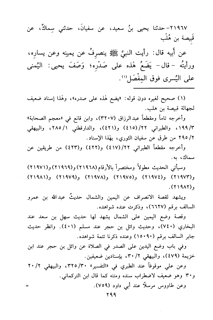 ٢١٩٦٧ - حَدَّثَنَا يَحْيَى بْنُ سَعِيدٍ، عَنْ سُفْيَانَ، حَدَّثَنِي سِمَاكٌ، عَنْ قَبِيصَةَ بْنِ هُلْبٍ، عَنْ أَبِيهِ، قَالَ: " رَأَيْتُ النَّبِيَّ صَلَّى اللهُ عَلَيْهِ وَسَلَّمَ يَنْصَرِفُ عَنْ يَمِينِهِ وَعَنْ يَسَارِهِ، وَرَأَيْتُهُ، قَالَ، يَضَعُ هَذِهِ عَلَى صَدْرِهِ " وَصَفَّ يَحْيَى: الْيُمْنَى عَلَى الْيُسْرَى فَوْقَ الْمِفْصَلِ (١)
