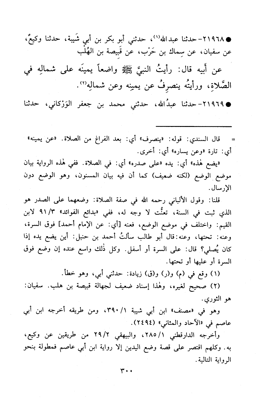• ٢١٩٦٨ - حَدَّثَنَا عَبْدُ اللهِ (١) حَدَّثَنِي أَبُو بَكْرِ بْنُ أَبِي شَيْبَةَ، حَدَّثَنَا وَكِيعٌ، عَنْ سُفْيَانَ، عَنْ سِمَاكِ بْنِ حَرْبٍ، عَنْ قَبِيصَةَ بْنِ الْهُلْبِ، عَنْ أَبِيهِ، قَالَ: " رَأَيْتُ النَّبِيَّ صَلَّى اللهُ عَلَيْهِ وَسَلَّمَ وَاضِعًا يَمِينَهُ عَلَى شِمَالِهِ فِي الصَّلَاةِ، وَرَأَيْتُهُ يَنْصَرِفُ عَنْ يَمِينِهِ وَعَنْ شِمَالِهِ " (٢)