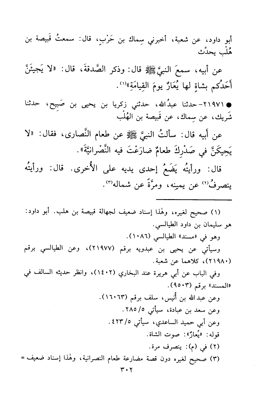 أَبُو دَاوُدَ، عَنْ شُعْبَةَ، أَخْبَرَنِي سِمَاكُ بْنُ حَرْبٍ، قَالَ: سَمِعْتُ قَبِيصَةَ بْنَ هُلْبٍ، يُحَدِّثُ عَنْ أَبِيهِ، سَمِعَ النَّبِيَّ صَلَّى اللهُ عَلَيْهِ وَسَلَّمَ قَالَ: وَذَكَرَ الصَّدَقَةَ، قَالَ: " لَا يَجِيئَنَّ أَحَدُكُمْ بِشَاةٍ لَهَا يُعَارٌ يَوْمَ الْقِيَامَةِ " (١)