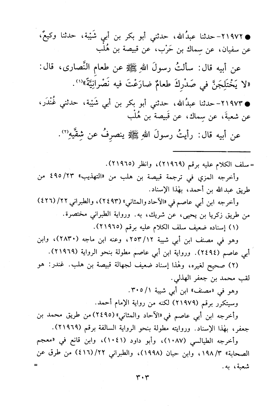 • ٢١٩٧٢ - حَدَّثَنَا عَبْدُ اللهِ، حَدَّثَنِي أَبُو بَكْرِ بْنُ أَبِي شَيْبَةَ، حَدَّثَنَا وَكِيعٌ، عَنْ سُفْيَانَ، عَنْ سِمَاكِ بْنِ حَرْبٍ، عَنْ قَبِيصَةَ بْنِ هُلْبٍ، عَنْ أَبِيهِ، قَالَ: سَأَلْتُ رَسُولَ اللهِ صَلَّى اللهُ عَلَيْهِ وَسَلَّمَ عَنْ طَعَامِ النَّصَارَى، قَالَ: " لَا يَخْتَلِجَنَّ فِي صَدْرِكَ طَعَامٌ ضَارَعْتَ فِيهِ نَصْرَانِيَّةً " (١)