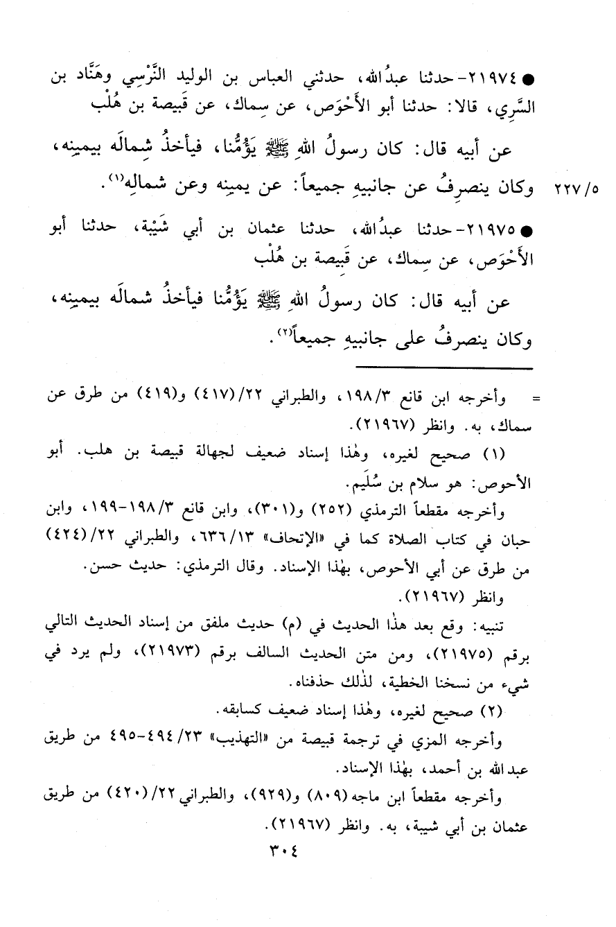 • ٢١٩٧٤ - حَدَّثَنَا عَبْدُ اللهِ، حَدَّثَنِي الْعَبَّاسُ بْنُ الْوَلِيدِ النَّرْسِيُّ، وَهَنَّادُ بْنُ السَّرِيِّ، قَالَا: حَدَّثَنَا أَبُو الْأَحْوَصِ، عَنْ سِمَاكٍ، عَنْ قَبِيصَةَ بْنِ هُلْبٍ، عَنْ أَبِيهِ، قَالَ: " كَانَ رَسُولُ اللهِ صَلَّى اللهُ عَلَيْهِ وَسَلَّمَ يَؤُمُّنَا، فَيَأْخُذُ شِمَالَهُ بِيَمِينِهِ، وَكَانَ يَنْصَرِفُ عَنْ جَانِبَيْهِ جَمِيعًا: عَنْ يَمِينِهِ وَعَنْ شِمَالِهِ " (١)
