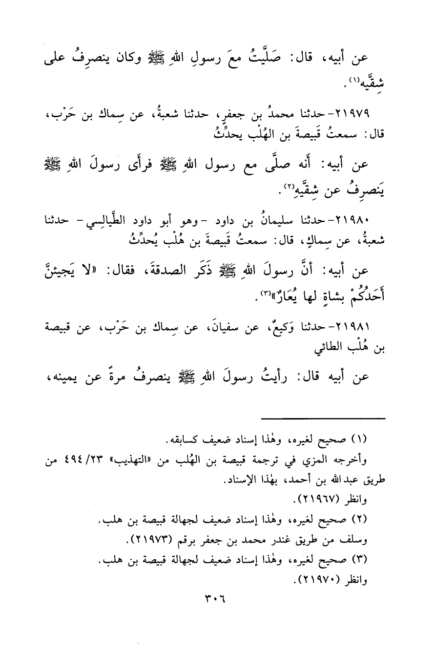 ٢١٩٧٩ - حَدَّثَنَا مُحَمَّدُ بْنُ جَعْفَرٍ، حَدَّثَنَا شُعْبَةُ، عَنْ سِمَاكِ بْنِ حَرْبٍ، قَالَ: سَمِعْتُ قَبِيصَةَ بْنَ الْهُلْبِ، يُحَدِّثُ عَنْ أَبِيهِ: أَنَّهُ " صَلَّى مَعَ رَسُولِ اللهِ صَلَّى اللهُ عَلَيْهِ وَسَلَّمَ فَرَأَى رَسُولَ اللهِ صَلَّى اللهُ عَلَيْهِ وَسَلَّمَ يَنْصَرِفُ عَنْ شِقَّيْهِ " (٢)