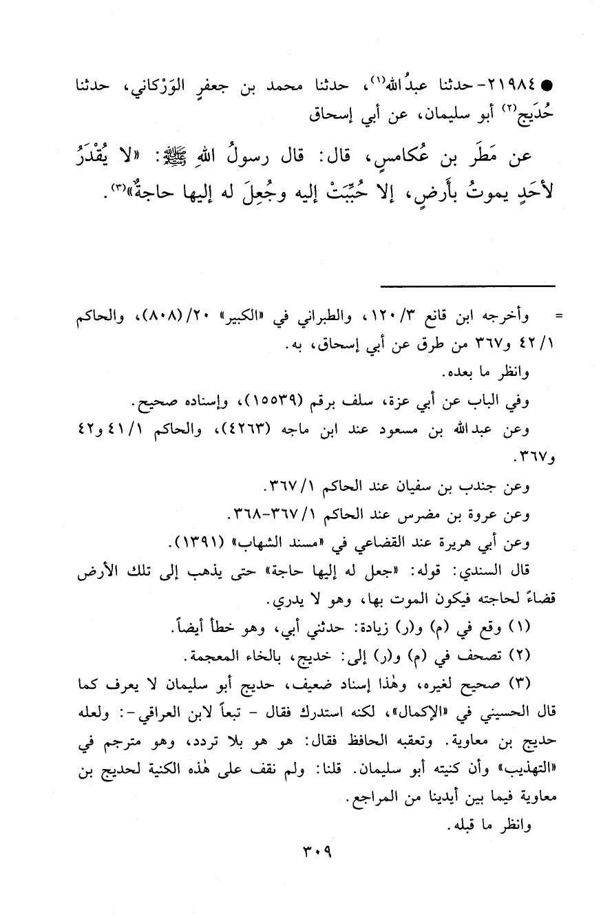 • ٢١٩٨٤ - حَدَّثَنَا عَبْدُ اللهِ، (١) حَدَّثَنَا مُحَمَّدُ بْنُ جَعْفَرٍ الْوَرَكَانِيُّ، حَدَّثَنَا حُدَيْجٌ (٢) أَبُو سُلَيْمَانَ، عَنْ أَبِي إِسْحَاقَ، عَنْ مَطَرِ بْنِ عُكَامِسٍ، قَالَ: قَالَ رَسُولُ اللهِ صَلَّى اللهُ عَلَيْهِ وَسَلَّمَ: " لَا يُقَدَّرُ لِأَحَدٍ يَمُوتُ بِأَرْضٍ، إِلَّا حُبِّبَتْ إِلَيْهِ وَجُعِلَ لَهُ إِلَيْهَا حَاجَةٌ " (٣)