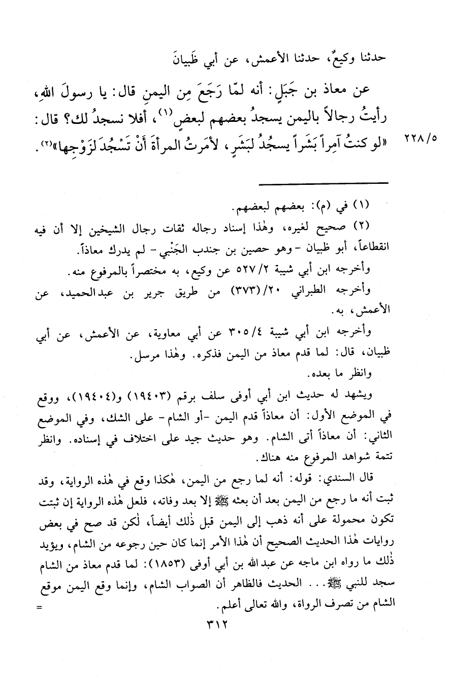 حَدَّثَنَا وَكِيعٌ، حَدَّثَنَا الْأَعْمَشُ، عَنْ أَبِي ظَبْيَانَ، عَنْ مُعَاذِ بْنِ جَبَلٍ: أَنَّهُ لَمَّا رَجَعَ مِنَ الْيَمَنِ، قَالَ: يَا رَسُولَ اللهِ، رَأَيْتُ رِجَالًا بِالْيَمَنِ يَسْجُدُ بَعْضُهُمْ لِبَعْضٍ (١) ، أَفَلَا نَسْجُدُ لَكَ؟ قَالَ: " لَوْ كُنْتُ آمِرًا بَشَرًا يَسْجُدُ لِبَشَرٍ، لَأَمَرْتُ الْمَرْأَةَ أَنْ تَسْجُدَ لِزَوْجِهَا " (٢)