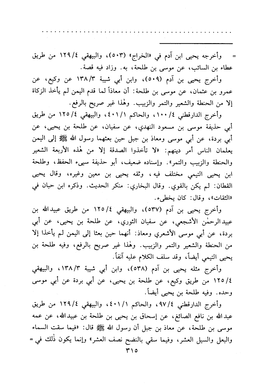 وأخرج يحيى بن آدم (٥٣٧) ، والبيهقي ٤/١٢٥ من طريق عبيد الله بن عبيد الرحمن الأشجعي، عن سفيان الثوري، عن طلحة بن يحيى، عن أبي بردة، عن أبي موسى الأشعري ومعاذ: أنهما حين بعثا إلى اليمن لم يأخذا إلا من الحنطة والشعير والتمر والزبيب. وهذا غير صريح بالرفع، وفيه طلحة بن يحيى التيمي أيضاً، وقد سلف الكلام عليه آنفاً.