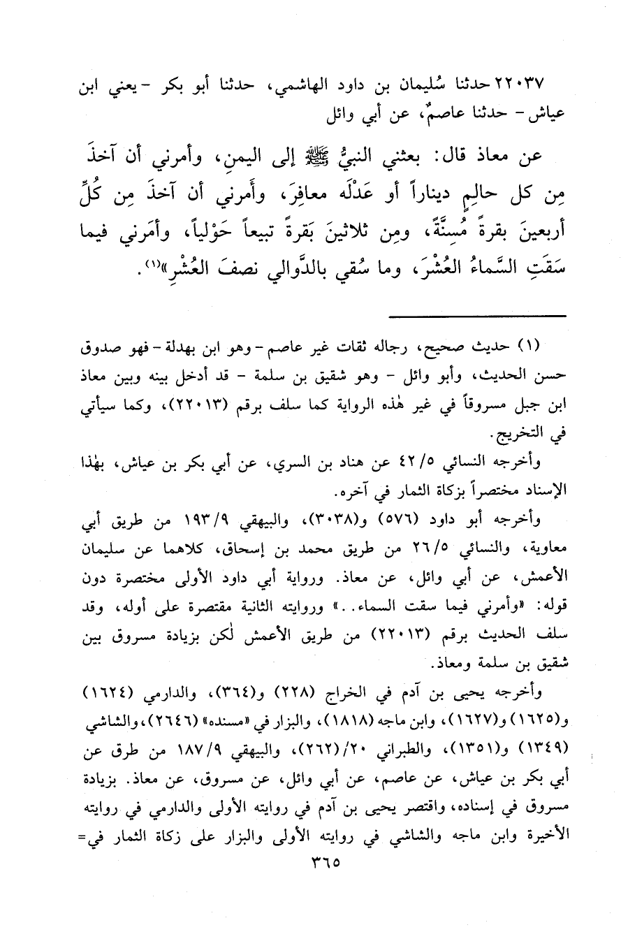 ٢٢٠٣٧ - حَدَّثَنَا سُلَيْمَانُ بْنُ دَاوُدَ الْهَاشِمِيُّ، حَدَّثَنَا أَبُو بَكْرٍ يَعْنِي ابْنَ عَيَّاشٍ، حَدَّثَنَا عَاصِمٌ، عَنْ أَبِي وَائِلٍ، عَنْ مُعَاذٍ قَالَ: بَعَثَنِي النَّبِيُّ صَلَّى اللهُ عَلَيْهِ وَسَلَّمَ إِلَى الْيَمَنِ " وَأَمَرَنِي أَنْ آخُذَ مِنْ كُلِّ حَالِمٍ دِينَارًا أَوْ عِدْلَهُ مَعَافِرَ، وَأَمَرَنِي أَنْ آخُذَ مِنْ كُلِّ أَرْبَعِينَ بَقَرَةً مُسِنَّةً، وَمِنْ ثَلَاثِينَ بَقَرَةً تَبِيعًا حَوْلِيًّا، وَأَمَرَنِي فِيمَا سَقَتِ السَّمَاءُ الْعُشْرَ، وَمَا سُقِيَ بِالدَّوَالِي نِصْفَ الْعُشْرِ " (١)