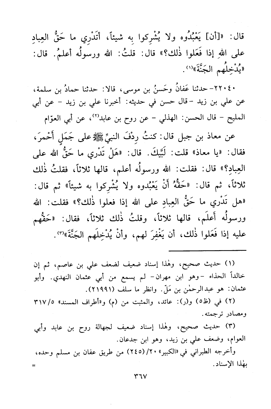 ٢٢٠٤٠ - حَدَّثَنَا عَفَّانُ، وَحَسَنُ بْنُ مُوسَى قَالَا: حَدَّثَنَا حَمَّادُ بْنُ سَلَمَةَ، عَنْ عَلِيِّ بْنِ زَيْدٍ قَالَ حَسَنٌ فِي حَدِيثِهِ: أخبرنا عَلِيُّ بْنُ زَيْدٍ، عَنْ أَبِي الْمَلِيحِ، قَالَ الْحَسَنُ: الْهُذَلِيِّ، عَنْ رَوْحِ بْنِ عَابِدٍ، (٢) عَنْ أَبِي الْعَوَّامِ، عَنْ مُعَاذِ بْنِ جَبَلٍ قَالَ: كُنْتُ رِدْفَ النَّبِيِّ صَلَّى اللهُ عَلَيْهِ وَسَلَّمَ عَلَى جَمَلٍ أَحْمَرَ فَقَالَ: " يَا مُعَاذُ ". قُلْتُ: لَبَّيْكَ. قَالَ: " هَلْ تَدْرِي مَا حَقُّ اللهِ عَلَى الْعِبَادِ؟ " قَالَ: فَقُلْتُ اللهُ وَرَسُولُهُ أَعْلَمُ،، قَالَهَا ثَلَاثًا، فَقُلْتُ ذَلِكَ ثَلَاثًا،، ثُمَّ قَالَ: " حَقُّهُ أَنْ يَعْبُدُوهُ وَلَا يُشْرِكُوا بِهِ شَيْئًا ". ثُمَّ قَالَ: " هَلْ تَدْرِي مَا حَقُّ الْعِبَادِ عَلَى اللهِ إِذَا فَعَلُوا ذَلِكَ؟ " فَقُلْتُ: اللهُ وَرَسُولُهُ أَعْلَمُ،، قَالَهَا ثَلَاثًا وَقُلْتُ ذَلِكَ ثَلَاثًا، فَقَالَ: " حَقُّهُمْ عَلَيْهِ إِذَا فَعَلُوا ذَلِكَ أَنْ يَغْفِرَ لَهُمْ، وَأَنْ يُدْخِلَهُمُ الْجَنَّةَ " (٣)