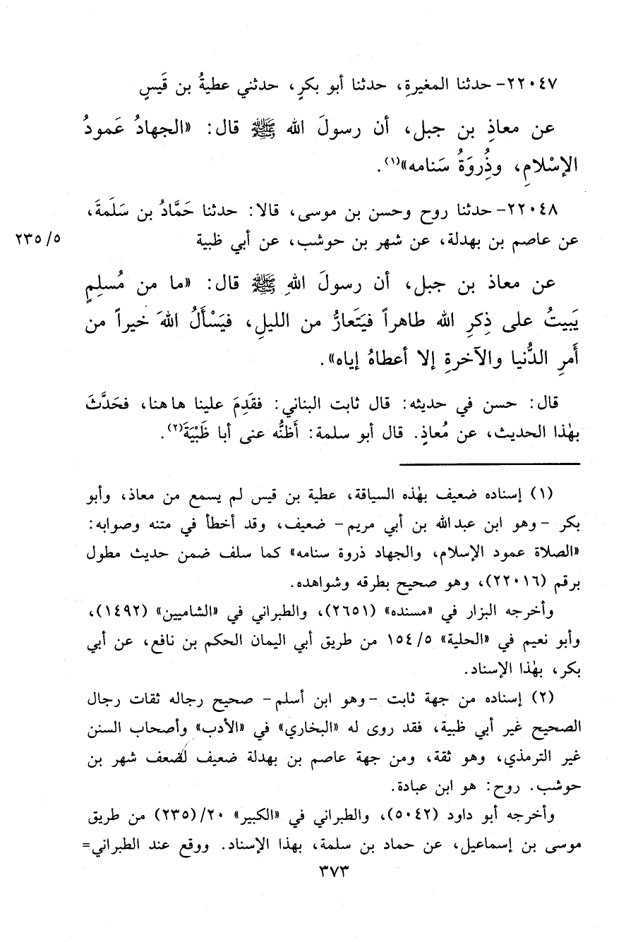 ٢٢٠٤٧ - حَدَّثَنَا أَبُو الْمُغِيرَةِ، حَدَّثَنَا أَبُو بَكْرٍ، حَدَّثَنِي عَطِيَّةُ بْنُ قَيْسٍ، عَنْ مُعَاذِ بْنِ جَبَلٍ، أَنَّ رَسُولَ اللهِ صَلَّى اللهُ عَلَيْهِ وَسَلَّمَ قَالَ: " الْجِهَادُ عَمُودُ الْإِسْلَامِ، وَذُرْوَةُ سَنَامِهِ " (١)
