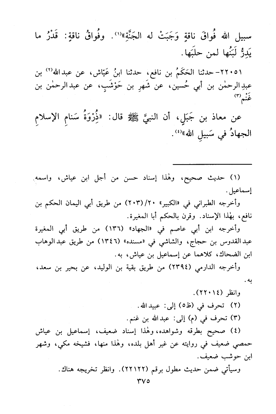 ٢٢٠٥١ - حَدَّثَنَا الْحَكَمُ بْنُ نَافِعٍ، حَدَّثَنَا ابْنُ عَيَّاشٍ، عَنْ عَبْدِ اللهِ (٢) بْنِ عَبْدِ الرَّحْمَنِ بْنِ أَبِي حُسَيْنٍ، عَنْ شَهْرِ بْنِ حَوْشَبٍ، عَنْ عَبْدِ الرَّحْمَنِ بْنِ غَنْمٍ (٣) ، عَنْ مُعَاذِ بْنِ جَبَلٍ، أَنَّ النَّبِيَّ صَلَّى اللهُ عَلَيْهِ وَسَلَّمَ قَالَ: " ذُرْوَةُ سَنَامِ الْإِسْلَامِ الْجِهَادُ فِي سَبِيلِ اللهِ " (٤)