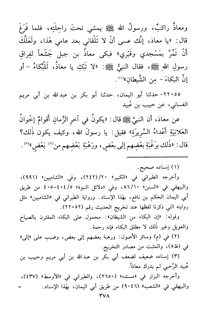 وَمُعَاذٌ رَاكِبٌ وَرَسُولُ اللهِ صَلَّى اللهُ عَلَيْهِ وَسَلَّمَ يَمْشِي تَحْتَ رَاحِلَتِهِ، فَلَمَّا فَرَغَ قَالَ: " يَا مُعَاذُ، إِنَّكَ عَسَى أَنْ لَا تَلْقَانِي بَعْدَ عَامِي هَذَا، وَلَعَلَّكَ أَنْ تَمُرَّ بِمَسْجِدِي وَقَبْرِي ". فَبَكَى مُعَاذُ بْنُ جَبَلٍ جَشَعًا لِفِرَاقِ رَسُولِ اللهِ صَلَّى اللهُ عَلَيْهِ وَسَلَّمَ، فَقَالَ النَّبِيُّ صَلَّى اللهُ عَلَيْهِ وَسَلَّمَ: " لَا تَبْكِ يَا مُعَاذُ لَلْبُكَاءُ، أَوْ إِنَّ الْبُكَاءَ، مِنَ الشَّيْطَانِ " (١)