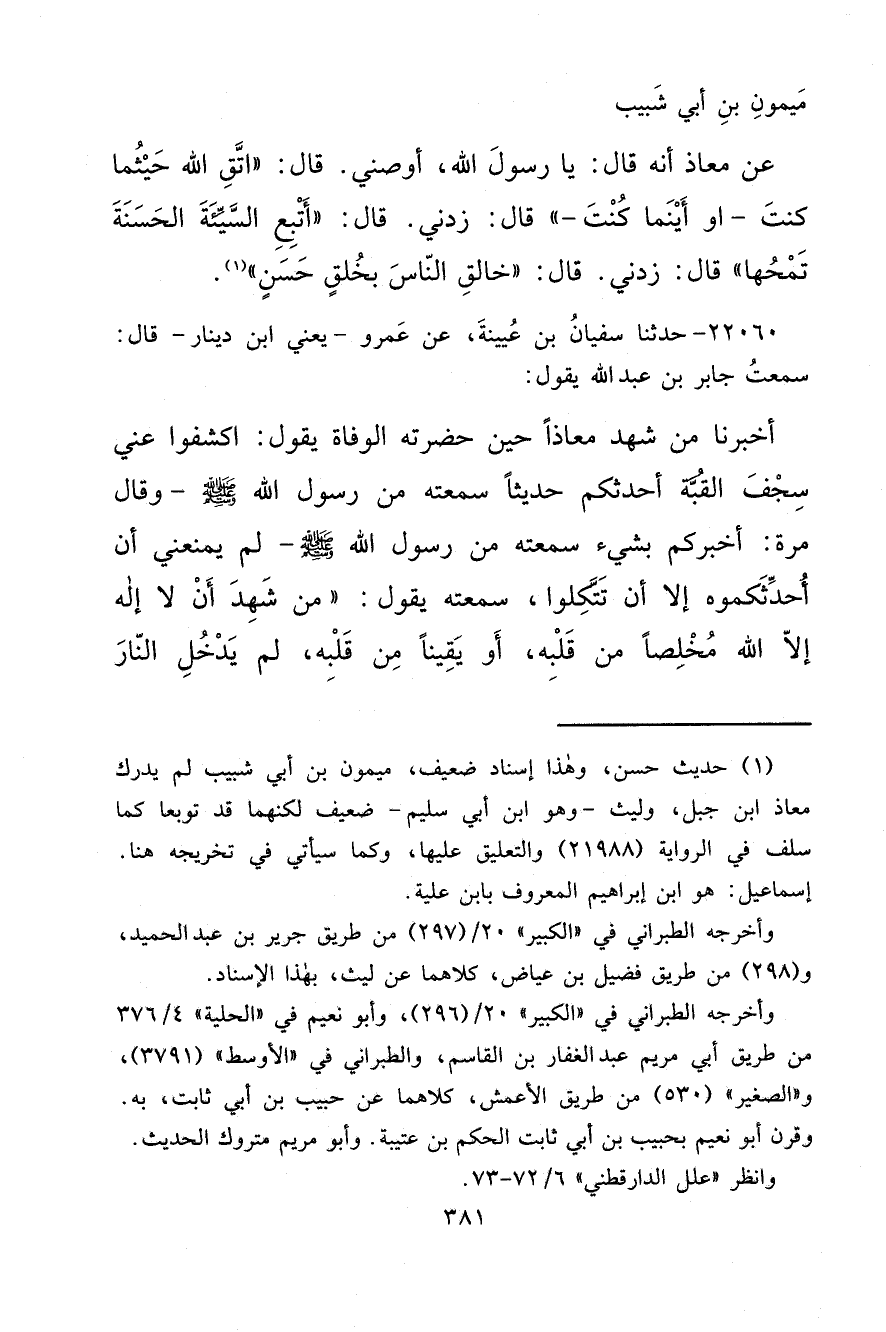 مَيْمُونِ بْنِ أَبِي شَبِيبٍ، عَنْ مُعَاذٍ أَنَّهُ قَالَ: يَا رَسُولَ اللهِ، أَوْصِنِي. قَالَ: " اتَّقِ اللهَ حَيْثُمَا كُنْتَ أَوْ أَيْنَمَا كُنْتَ ". قَالَ: زِدْنِي قَالَ: " أَتْبِعِ السَّيِّئَةَ الْحَسَنَةَ تَمْحُهَا ". قَالَ: زِدْنِي. قَالَ: " خَالِقِ النَّاسَ بِخُلُقٍ حَسَنٍ " (١)