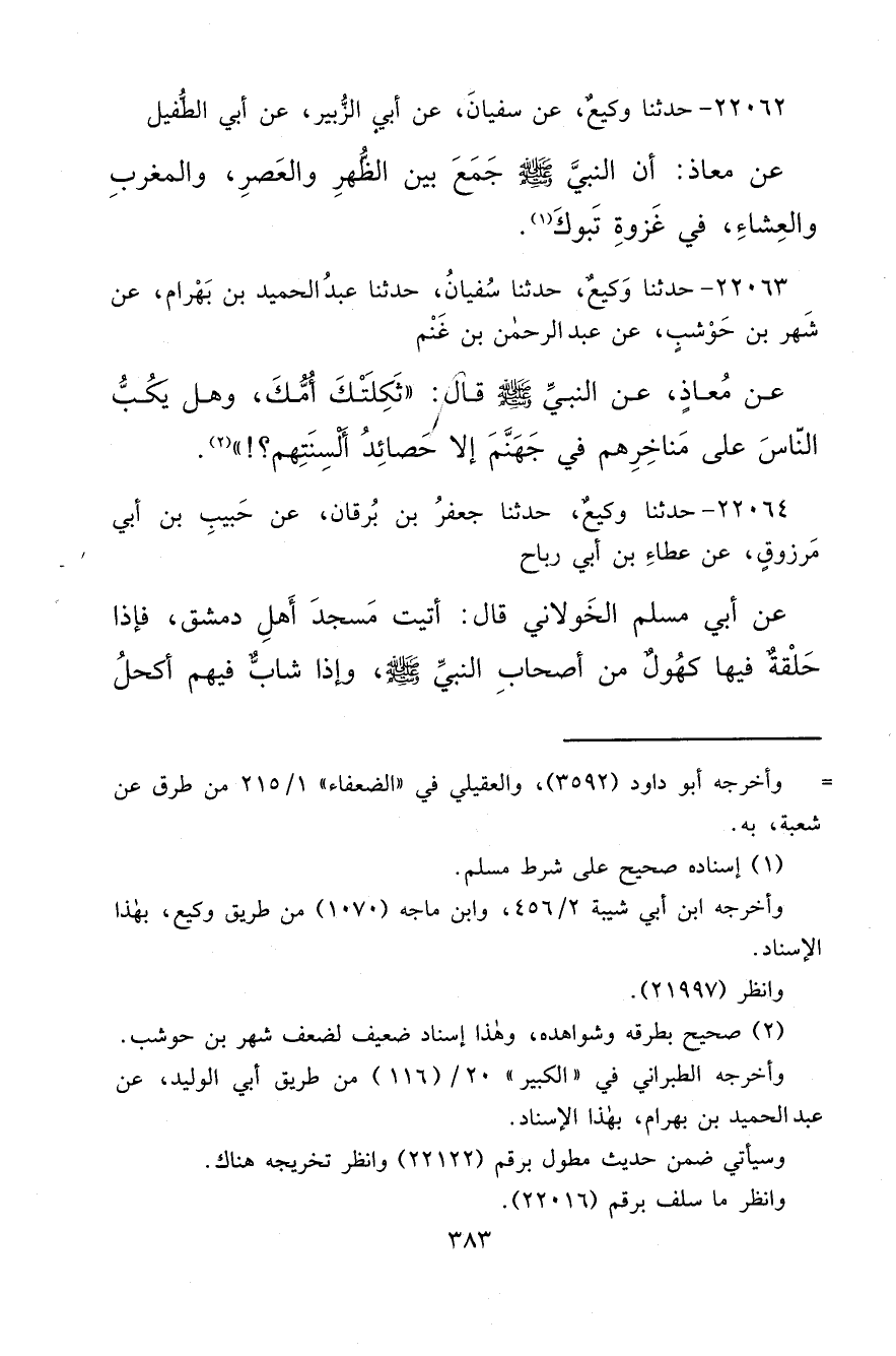 ٢٢٠٦٣ - حَدَّثَنَا وَكِيعٌ، حَدَّثَنَا سُفْيَانُ، حَدَّثَنَا عَبْدُ الْحَمِيدِ بْنُ بَهْرَامَ، عَنْ شَهْرِ بْنِ حَوْشَبٍ، عَنْ عَبْدِ الرَّحْمَنِ بْنِ غَنْمٍ، عَنْ مُعَاذٍ، عَنِ النَّبِيِّ صَلَّى اللهُ عَلَيْهِ وَسَلَّمَ قَالَ: " ثَكِلَتْكَ أُمُّكَ، وَهَلْ يَكُبُّ النَّاسَ عَلَى مَنَاخِرِهِمْ فِي جَهَنَّمَ إِلَّا حَصَائِدُ أَلْسِنَتِهِمْ؟ " (٢)