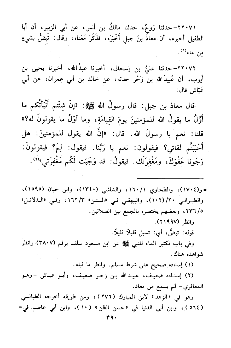 ٢٢٠٧٢ - حَدَّثَنَا عَلِيُّ بْنُ إِسْحَاقَ، أَخْبَرَنَا عَبْدُ اللهِ، أَخْبَرَنَا يَحْيَى بْنُ أَيُّوبَ، أَنَّ عُبَيْدَ اللهِ بْنَ زَحْرٍ حَدَّثَهُ، عَنْ خَالِدِ بْنِ أَبِي عِمْرَانَ، عَنْ أَبِي عَيَّاشٍ قَالَ: قَالَ مُعَاذُ بْنُ جَبَلٍ: قَالَ رَسُولُ اللهِ صَلَّى اللهُ عَلَيْهِ وَسَلَّمَ: " إِنْ شِئْتُمْ أَنْبَأْتُكُمْ مَا أَوَّلُ مَا يَقُولُ اللهُ لِلْمُؤْمِنِينَ يَوْمَ الْقِيَامَةِ، وَمَا أَوَّلُ مَا يَقُولُونَ لَهُ؟ " قُلْنَا: نَعَمْ يَا رَسُولَ اللهِ. قَالَ: " إِنَّ اللهَ يَقُولُ لِلْمُؤْمِنِينَ: هَلْ أَحْبَبْتُمْ لِقَائِي؟ فَيَقُولُونَ: نَعَمْ يَا رَبَّنَا. فَيَقُولُ: لِمَ؟ فَيَقُولُونَ: رَجَوْنَا عَفْوَكَ، وَمَغْفِرَتَكَ. فَيَقُولُ قَدْ وَجَبَتْ لَكُمْ مَغْفِرَتِي " (٢)