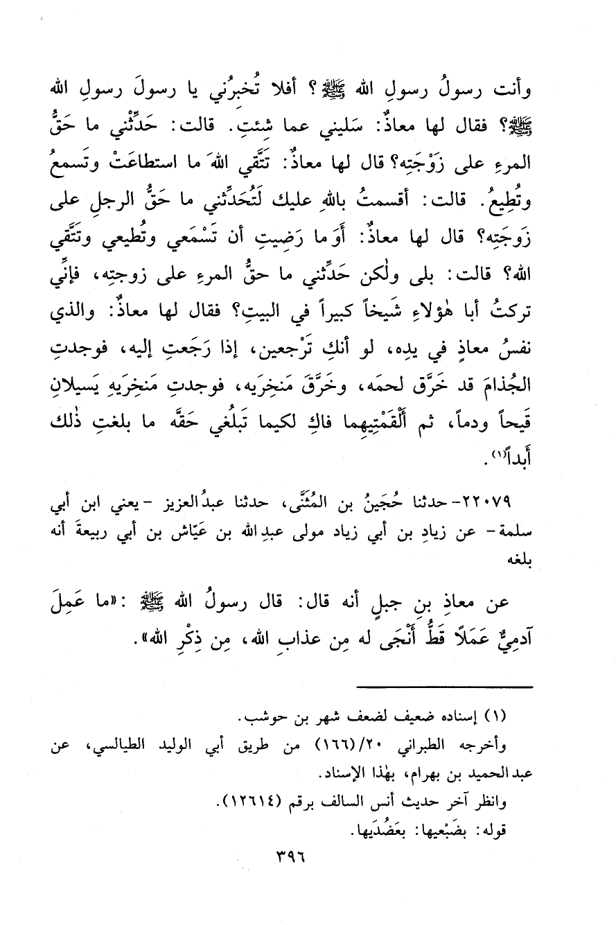 وَأَنْتَ رَسُولُ رَسُولِ اللهِ صَلَّى اللهُ عَلَيْهِ وَسَلَّمَ ؟ أَفَلَا تُخْبِرُنِي يَا رَسُولَ رَسُولِ اللهِ صَلَّى اللهُ عَلَيْهِ وَسَلَّمَ؟ فَقَالَ لَهَا مُعَاذٌ: " سَلِينِي عَمَّا شِئْتِ ". قَالَتْ: حَدِّثْنِي مَا حَقُّ الْمَرْءِ عَلَى زَوْجَتِهِ؟ قَالَ لَهَا مُعَاذٌ: " تَتَّقِي اللهَ مَا اسْتَطَاعَتْ وَتَسْمَعُ وَتُطِيعُ ". قَالَتْ: أَقْسَمْتُ بِاللهِ عَلَيْكَ لَتُحَدِّثَنِّي مَا حَقُّ الرَّجُلِ عَلَى زَوْجَتِهِ؟ قَالَ لَهَا مُعَاذٌ: " أَوَ مَا رَضِيتِ أَنْ تَسْمَعِي وَتُطِيعِي وَتَتَّقِي اللهَ؟ " قَالَتْ: بَلَى. وَلَكِنْ حَدِّثْنِي مَا حَقُّ الْمَرْءِ عَلَى زَوْجَتِهِ؛ فَإِنِّي تَرَكْتُ أَبَا هَؤُلَاءِ شَيْخًا كَبِيرًا فِي الْبَيْتِ؟ فَقَالَ لَهَا مُعَاذٌ: " وَالَّذِي نَفْسُ مُعَاذٍ فِي يَدِهِ لَوْ أَنَّكِ تَرْجِعِينَ إِذَا رَجَعْتِ إِلَيْهِ، فَوَجَدْتِ الْجُذَامَ قَدْ خَرَقَ لَحْمَهُ، وَخَرَقَ مَنْخِرَيْهِ فَوَجَدْتِ مَنْخِرَيْهِ يَسِيلَانِ قَيْحًا وَدَمًا، ثُمَّ أَلْقَمْتِيهِمَا فَاكِ لِكَيْ مَا تَبْلُغِي حَقَّهُ مَا بَلَغْتِ ذَلِكَ أَبَدًا " (١)