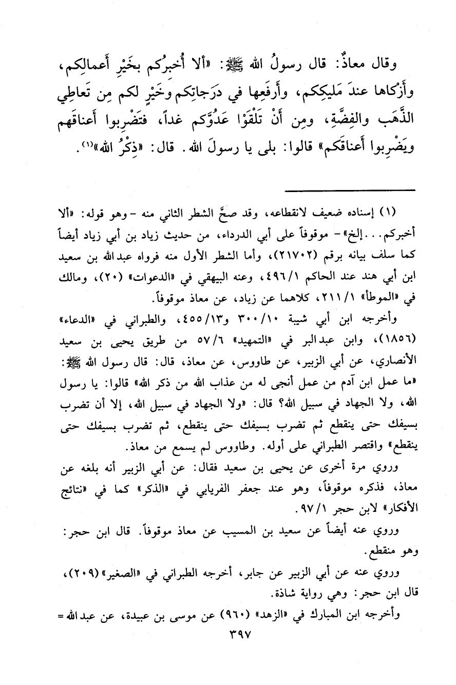 وقَالَ مُعَاذٌ: قَالَ رَسُولُ اللهِ صَلَّى اللهُ عَلَيْهِ وَسَلَّمَ: " أَلَا أُخْبِرُكُمْ بِخَيْرِ أَعْمَالِكُمْ وَأَزْكَاهَا عِنْدَ مَلِيكِكُمْ وَأَرْفَعِهَا فِي دَرَجَاتِكُمْ؟ وَخَيْرٍ لَكُمْ مِنْ تَعَاطِي الذَّهَبِ وَالْفِضَّةِ، وَمِنْ أَنْ تَلْقَوْا عَدُوَّكُمْ غَدًا فَتَضْرِبُوا أَعْنَاقَهُمْ، وَيَضْرِبُوا أَعْنَاقَكُمْ ". قَالُوا: بَلَى. يَا رَسُولَ اللهِ. قَالَ: " ذِكْرُ اللهِ " (١)